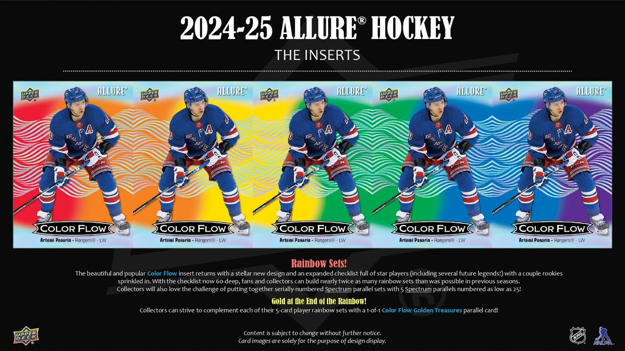 THE BASE SET: Allure Hockey returns with a 150-card Base Set consisting of 100 veteran standouts and 50 rookies - the latter falling one (1) per pack, on average. From the popular Black Rainbow, Red Rainbow, Red Rainbow Auto and Orange Slice parallels to the coveted 1-of-1 Golden Treasures and Golden Treasures Auto parallels, the Base Set lineup is deep and full of chase cards! The product also includes the Base Set Printing Plates.