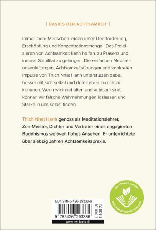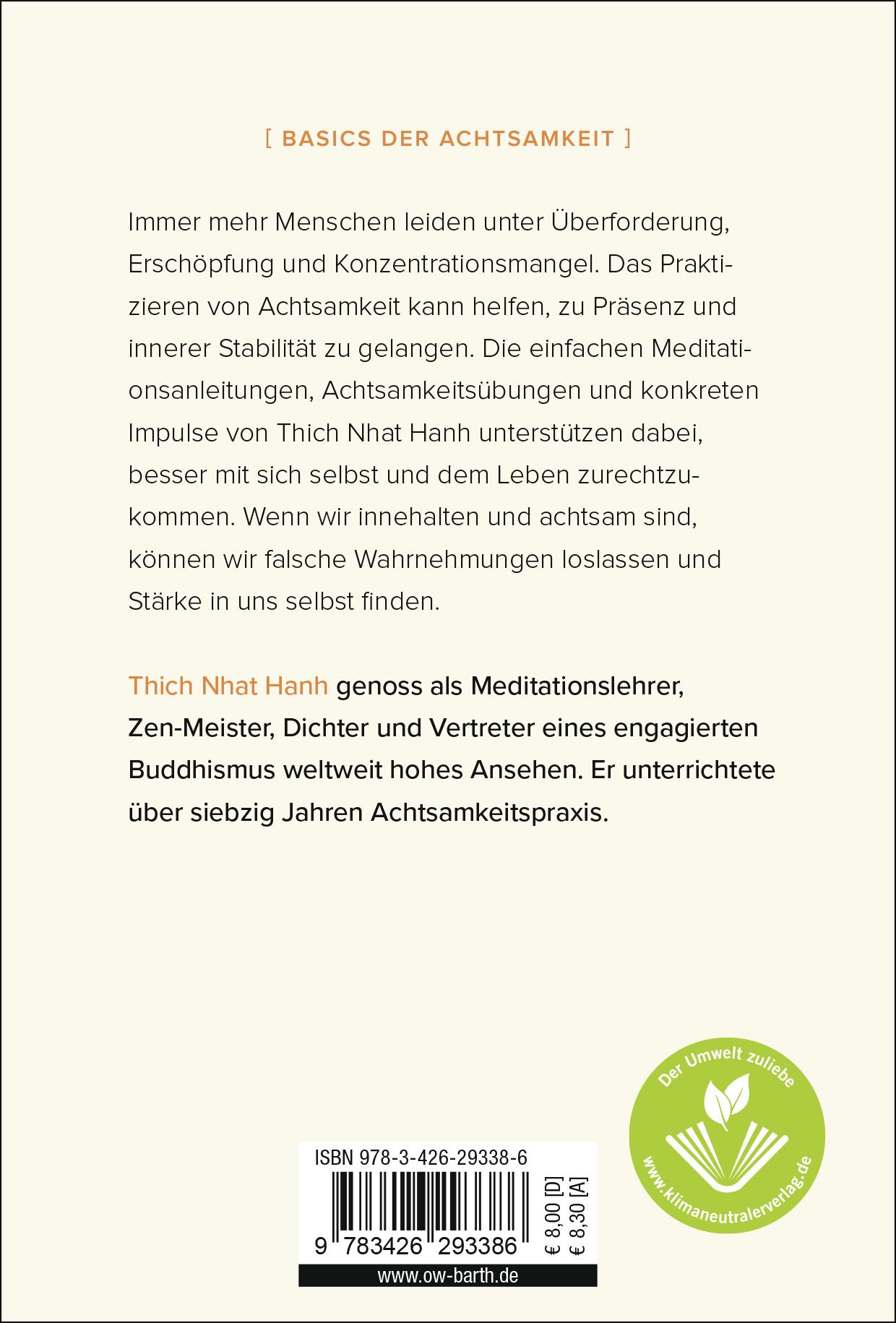 Viele Menschen erfahren Überforderung, Erschöpfung und Konzentrationsmangel. Der Schlüssel zu einer inneren Stabilität heißt Achtsamkeit. Denn wie Thich Nhat Hanh in diesem Ratgeber erklärt, bringt das Praktizieren von Achtsamkeit Konzentration und Präsenz, und dies wiederum führt zu Einsicht, Verständnis und Glück. Er erklärt in seinem Buch unter anderem die fünf universellen mentalen Formationen, die in unserem Gehirn einen neuronalen Pfad bilden und die ganze Zeit über aktiv sind: Kontakt, Gefühl, Aufmerksamkeit, Wahrnehmung und Wille. Sie bilden eine Abfolge, wobei eine mentale Formation zur nächsten führt, und der gesamte Prozess kann in weniger als einer Sekunde stattfinden. Dieser neuronale Pfad kann uns zu einer gewohnheitsmäßigen Reaktion führen oder, wie Thich Nhat Hanh zeigt, durch den Einfluss von Achtsamkeit und Einsicht, einen neuen neuronalen Pfad schaffen, der zu Verständnis und Mitgefühl, Glück und Heilung führt. Die einfachen Meditationsanleitungen und Achtsamkeitsübungen des Zen-Meisters helfen, besser mit sich selbst und dem Leben zurechtzukommen. Dieser hübsch gestaltete Achtsamkeitsratgeber im Taschenformat zeigt uns, wie wichtig es ist, innezuhalten und präsent zu sein, damit wir falsche Wahrnehmungen loslassen können und Klarheit und Stärke in uns selbst finden.