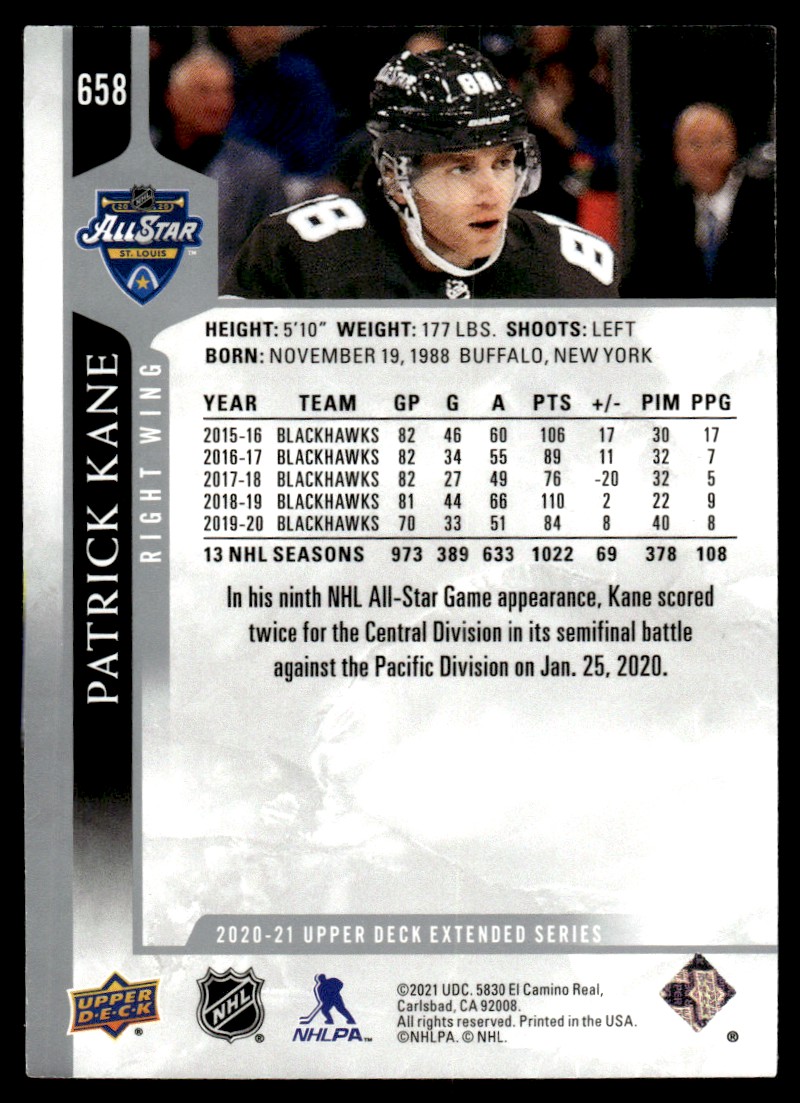 | 2020-21 Upper Deck Patrick Kane Chicago Blackhawks #658 17018 |