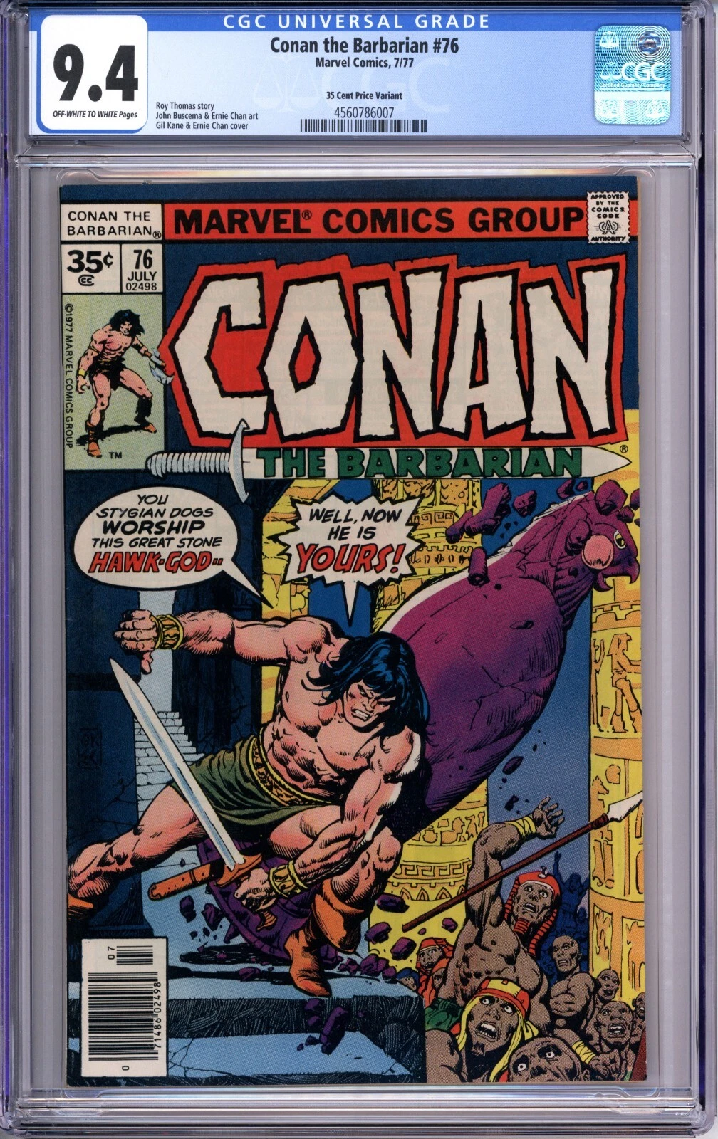 Up for sale is a copy of Conan the Barbarian #76 graded 9.4 NM with off-white to white pages by CGC. This is a very rare 35 cent price variant. This will be packaged securely between thick sheets of cardboard and bubble wrap and shipped in a box via USPS priority mail. I do combine shipping on multiple items; feel free to email with any questions.