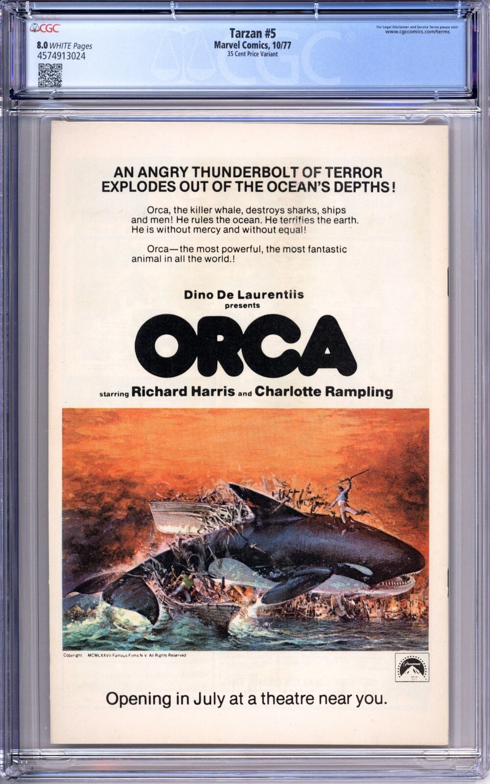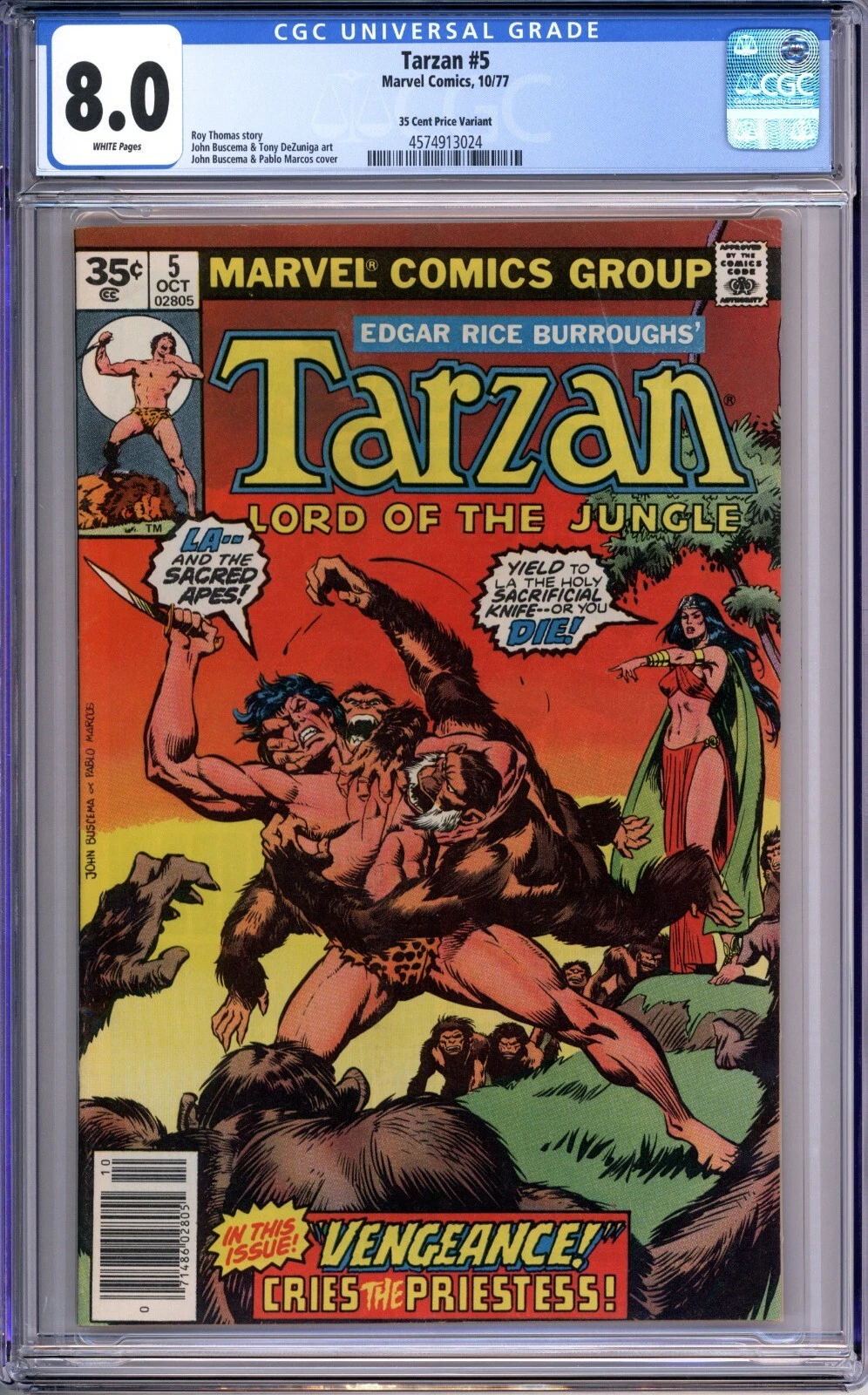 Up for sale is a copy of Tarzan #5 graded 8.0 VF with white pages by CGC. This is a very rare 35 cent price variant. This will be packaged securely between thick sheets of cardboard and bubble wrap and shipped in a box via USPS priority mail. I do combine shipping on multiple items; feel free to email with any questions.