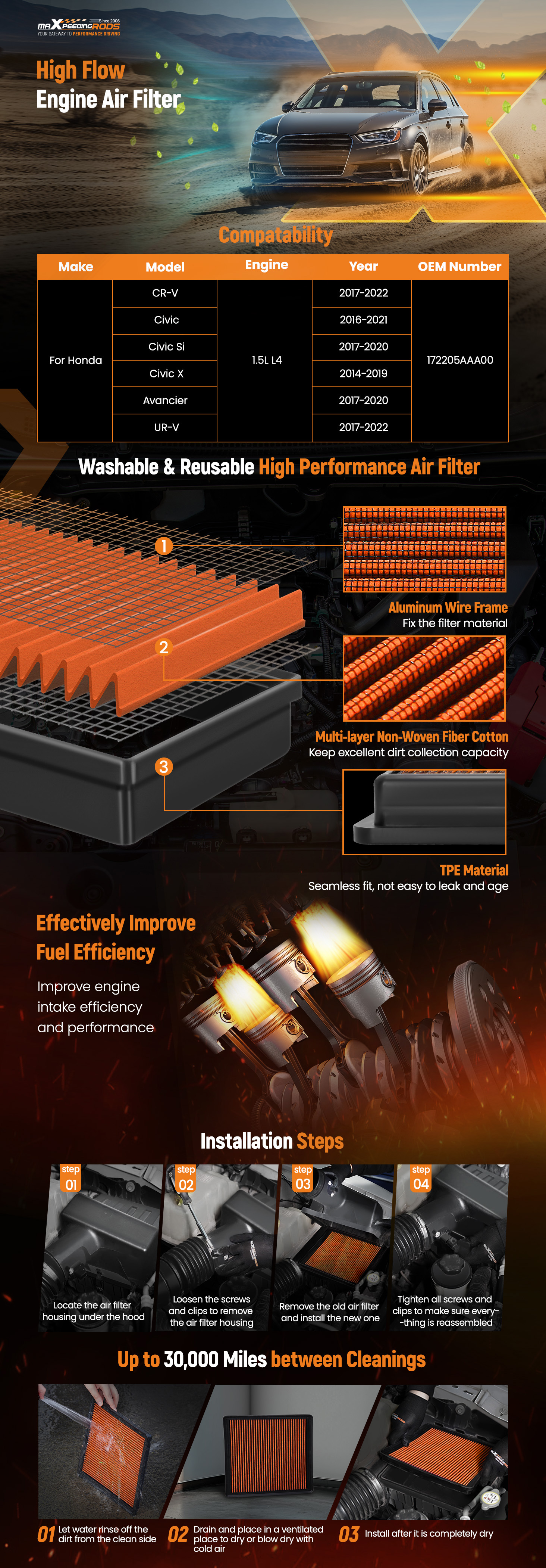 *Washable, reusable and requires no oil:Engine air filter only needs cleaning every 30,000 miles under normal highway driving conditions.