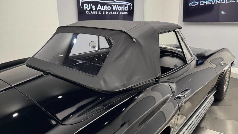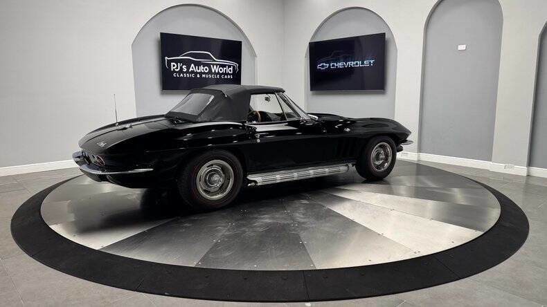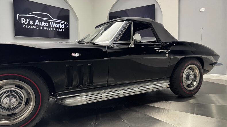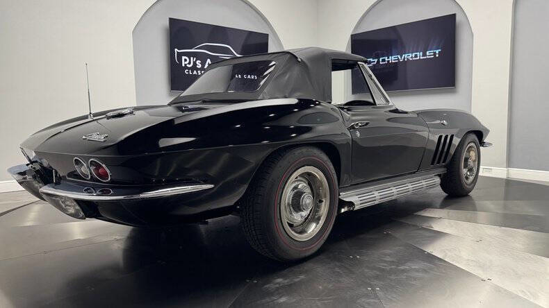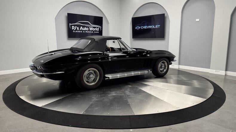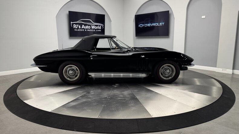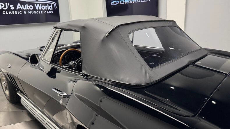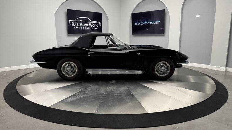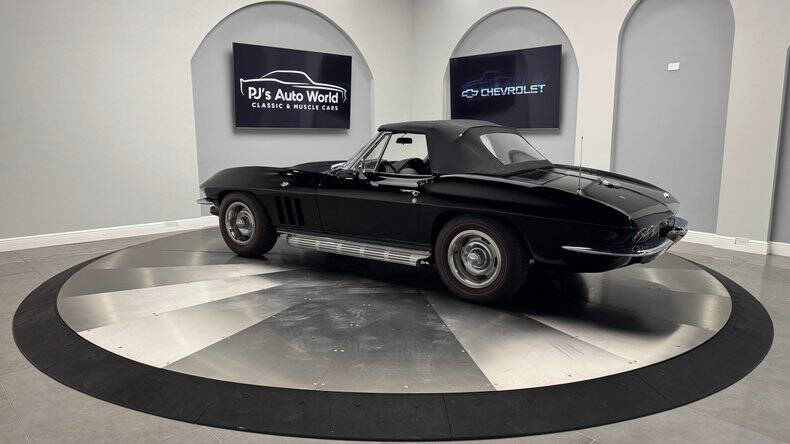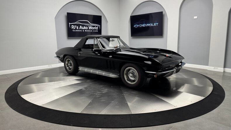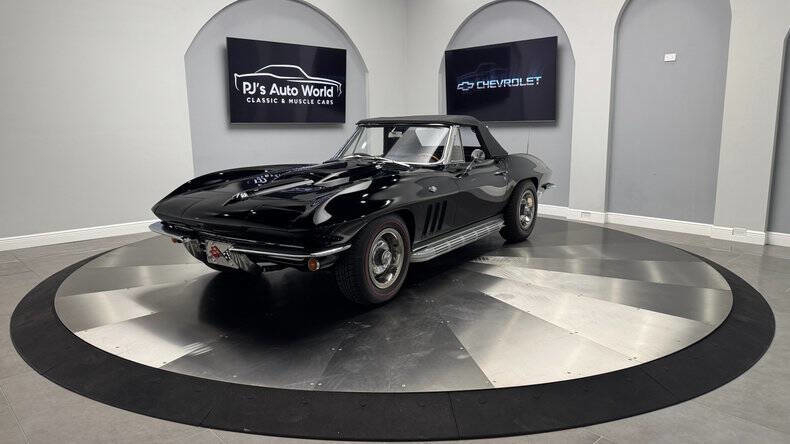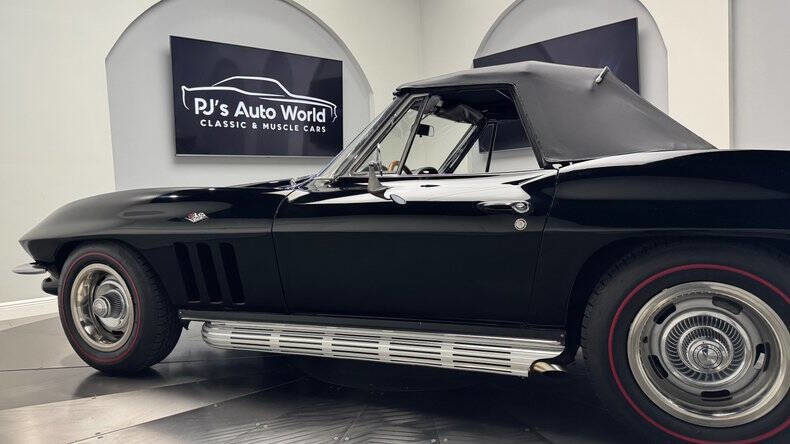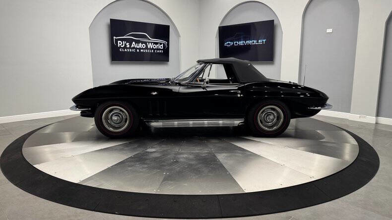 PJ's Auto World is pleased to offer this 1965 Chevrolet Corvette Stingray Convertible for Sale. 327 V8, SA Suffix Code engine block, Eldelbrock aluminum intake, Holley 4-barrel carburetor, HEI electronic ignition, side exhaust, Muncie 4-Speed manual transmission, 15 Rally Wheels with BF Goodrich Silvertown radial red line tires, refinished black with a Stinger style hood, hideaway headlights, driver's chrome mirror, black convertible top, black bucket seat interior, 3-spoke wood trim steering wheel, beautiful gauge package, AM/FM radio. Come in and check out this beautiful Mid-Year Corvette! With over 45 years of dedicated service to the Collector Car Community, our team is eager to answer any questions you may have. Finance options available and worldwide shipping can easily be arr