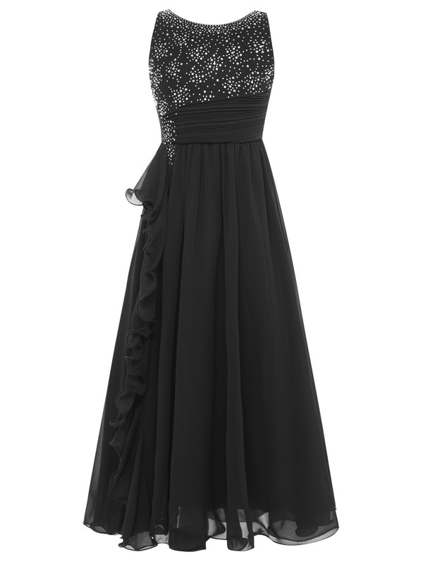 The chiffon hem with side ruffled trim gives the dress a romantic and flowing feel. The ruffled detail is a popular element in the current fashion scene, adding a sweet and charming touch.