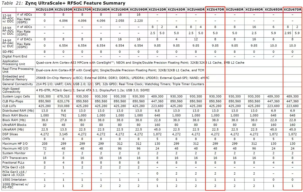 - XCZU47DR: 8-channel AD (14 bit 5.0 GSPS), 8-channel DA (9.85 GSPS)