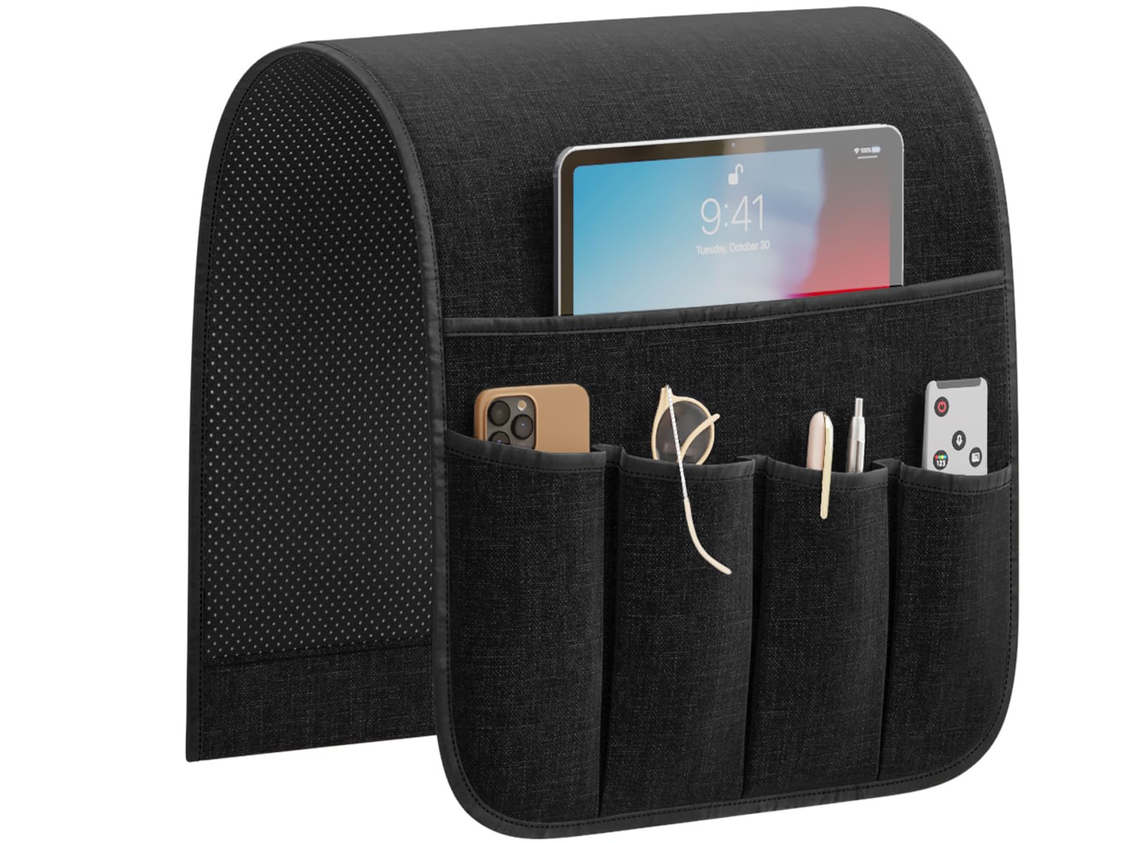 Stuff Organizer Function: 5 pockets of the armrest organizer are designed for your necessities.The biggest pocket for placing magazines, books and iPad, newspapers, Other 4 small pockets to hold your flashlights, TV remote controls, glasses , Smart phone, headphones and so on. it is a very convenient storage helper that Keeps everything within reach