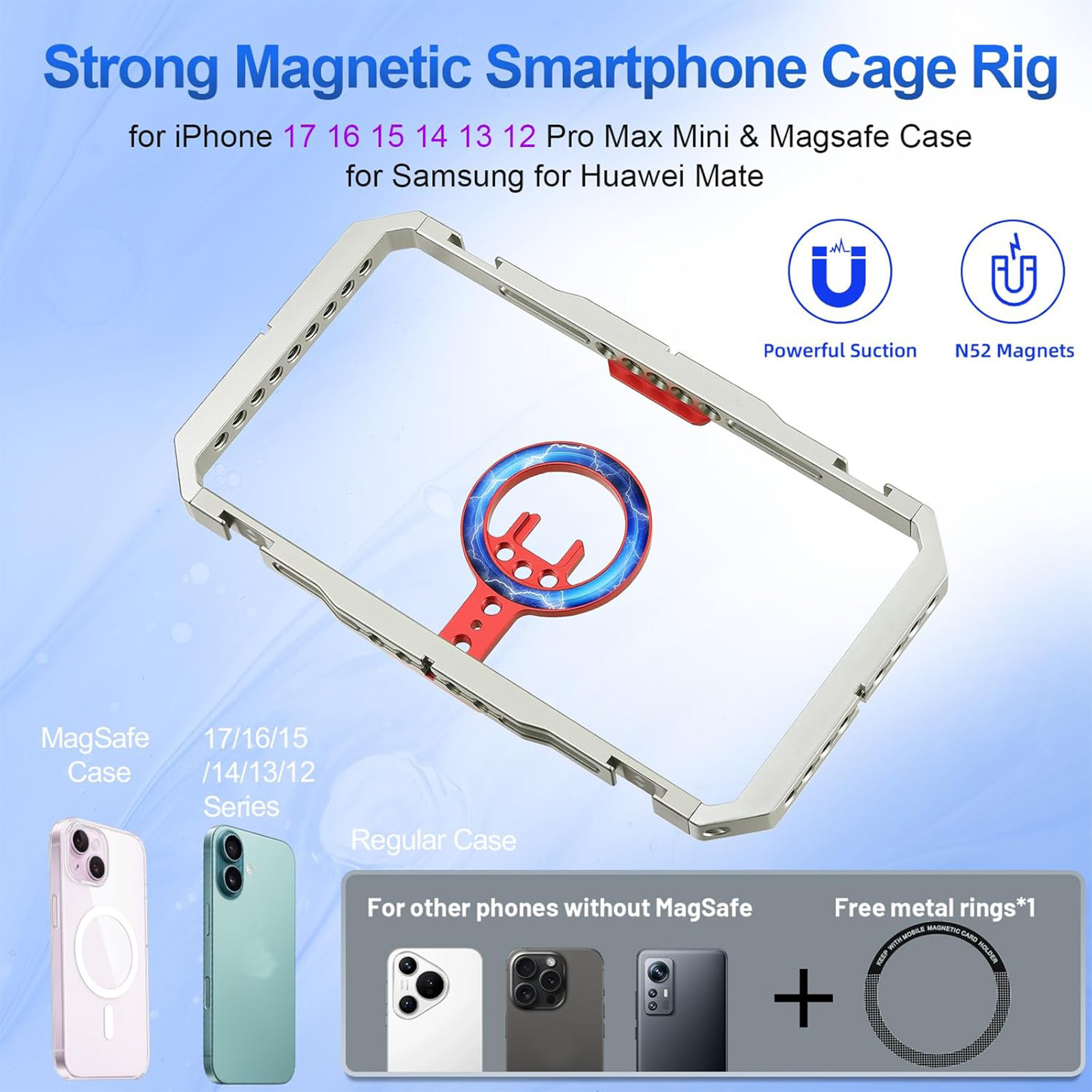 Strong MagSafe Magnetic Mount This phone cage features built-in powerful magnets and a soft silicone pad, allowing you to attach your phone instantly and securely without any scratches