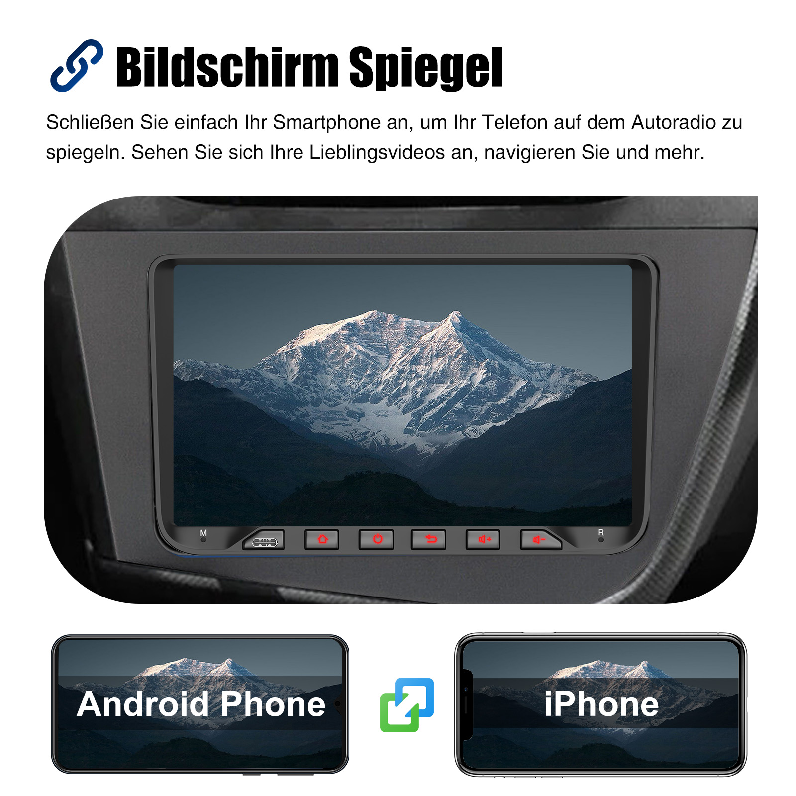 Bildschirm Spiegel für iOS/Android: Das Autoradio unterstützt Mirror Link für iOS/Android. Nachdem Sie das Radio angeschlossen haben, können Sie die Telefonseite mit dem 9-Zoll-Touchscreen des Radios synchronisieren. Das iPhone stellt eine Verbindung über WLAN her, und das Android-Telefon stellt eine Verbindung über WLAN oder das Original-USB-Kabel her (gilt nicht für Samsung- und Huawei-Telefone).