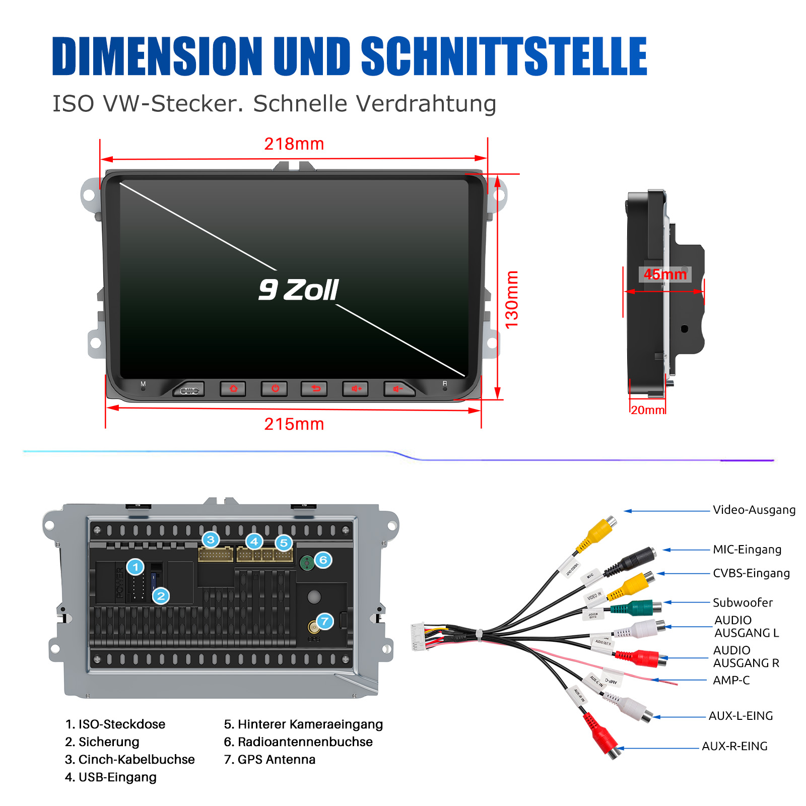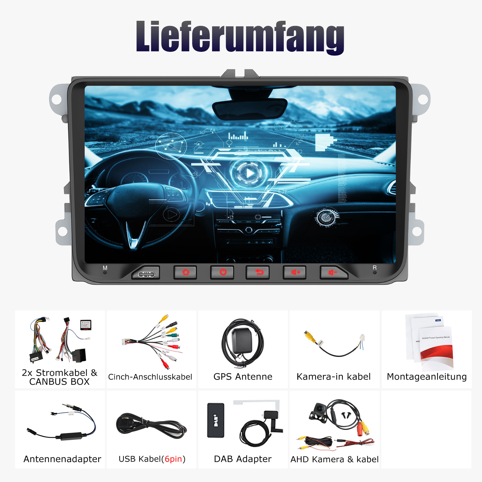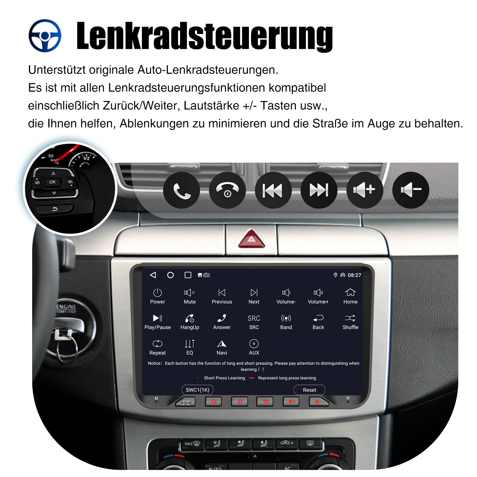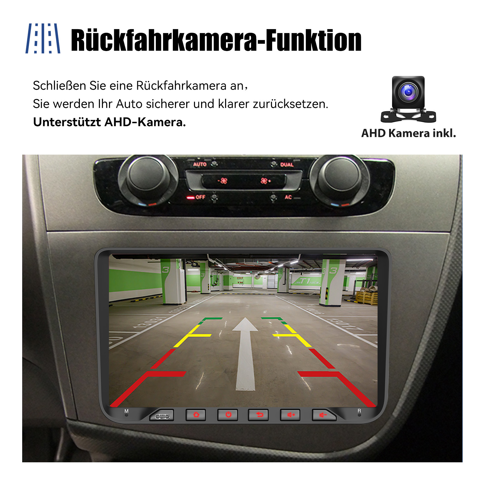 AHD Rückfahrkameraeingang und Lenkradkontrolle: Nach dem Anschluss an die Rückfahrkamera. Das Radio zeigt automatisch das Rückfahrbild an, sobald Sie den Rückwärtsgang einlegen. Machen Sie Ihr tägliches Rückwärtsfahren sicherer. Unterstützt AHD-Kamera. Unterstützt die originale Auto-Lenkradsteuerung (wenn Ihr Auto Canbus nicht unterstützt und SIE die Lenkradtasten lernen), um das Fahren bequemer und sicherer zu machen.