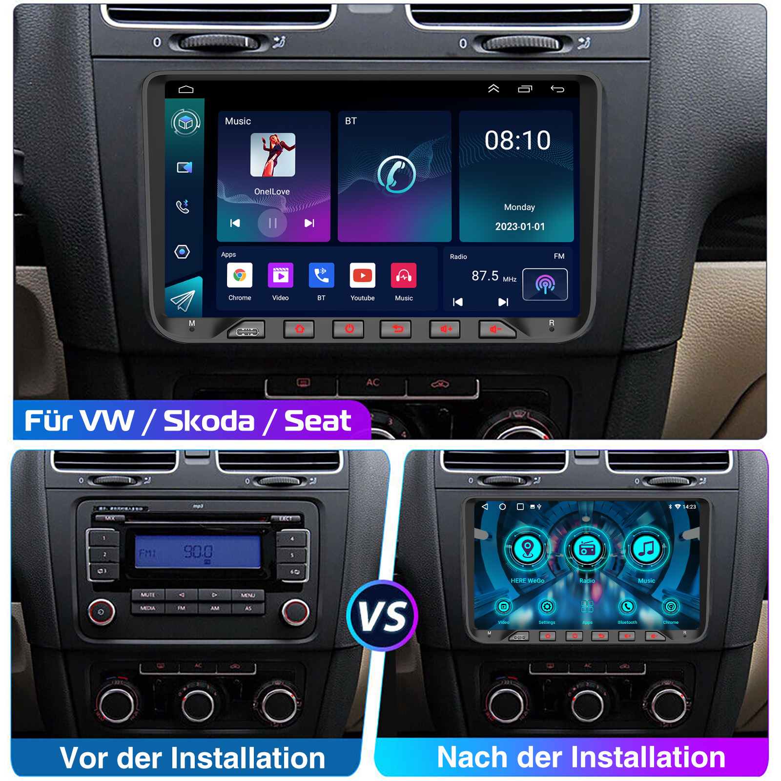 9 Zoll Android 14 Autoradio für VW GOLF: Dieses Bluetooth Autoradio ist geeignet für VW/PASSAT/GOLF/SEAT/SKODA/POLO. Das Android Autoradio mit kapazitivem 9 Zoll IPS Touchscreen, 4 GB RAM und 64 GB ROM bietet Ihnen genug Platz zum Download Ihrer Lieblings-Apps und -Videos, damit das Autofahren nicht mehr langweilig wird. Mit USB Type-C Anschlüssen unterstützt es das schnelle Aufladen von Mobiltelefonen.