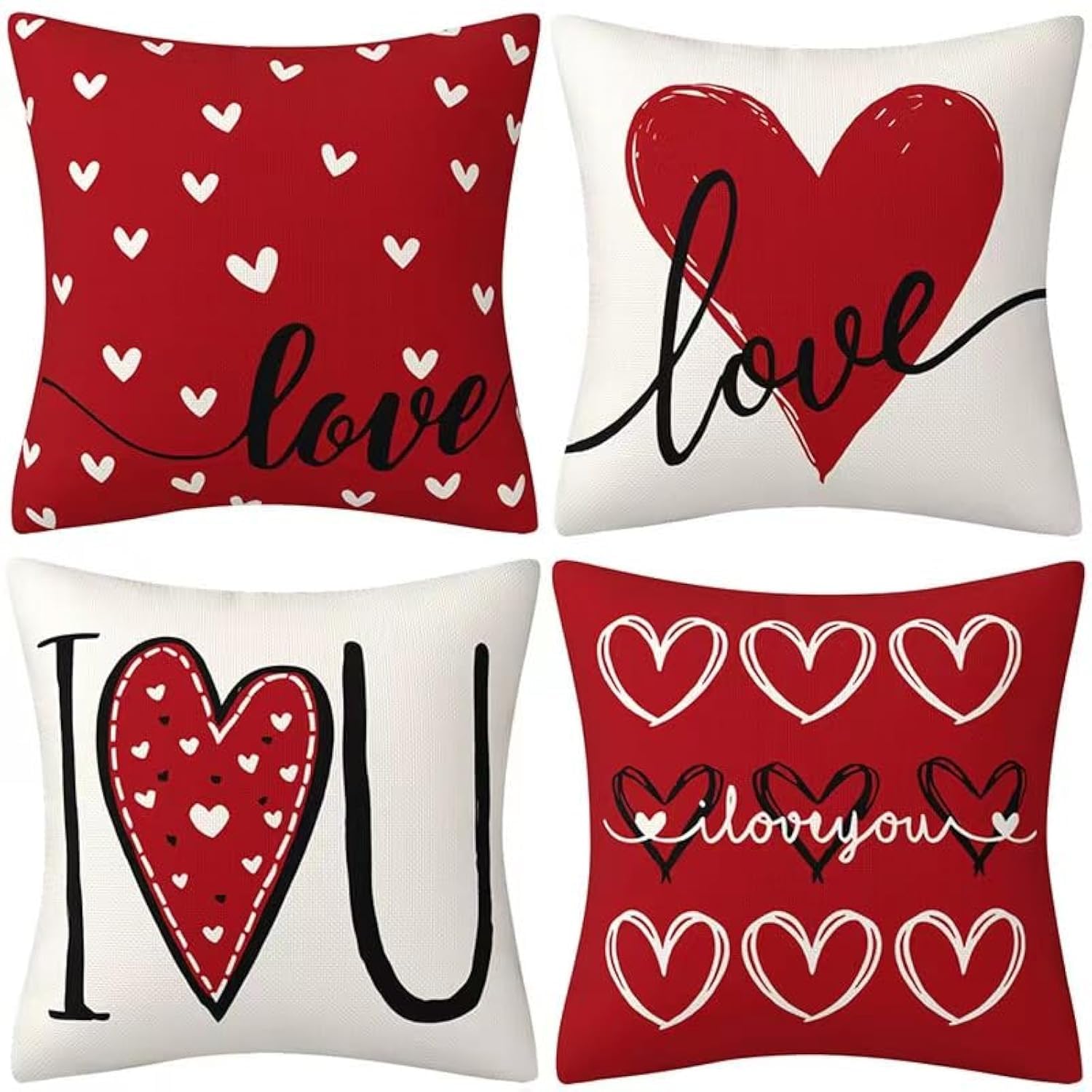 Valentines Day Decor-Throw Pillow Covers 18x18 in Set of 4,Valentine Linen Pillow Case with Red Heart Love You More for Large Couch Sofa Home Indoor Outdoor Holiday Decorations New