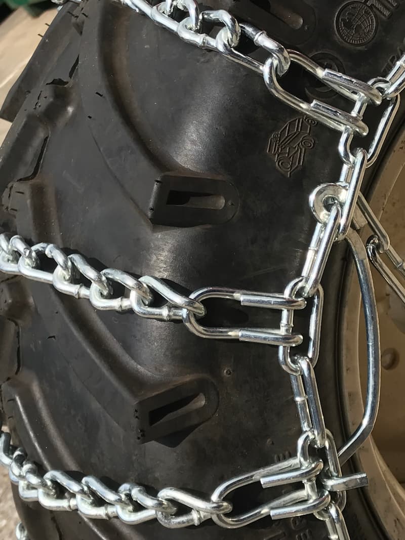 Important: The Tire Size in this listing is in the factory publication for your tractor. Heavy Duty Tire Chain is made of thicker cross chain and thicker side chain and fasteners. Twisted Link Chains are recommended for pavement and concrete. 2 link snow chains, cross chains occur every other side chain link giving consistent ride with less grip-slip like a 4 link chain. Optional Tensioner is recommended for maximum life and performance of chains. For easier installation of two and four link chains see our Sno-Chain Ramps.