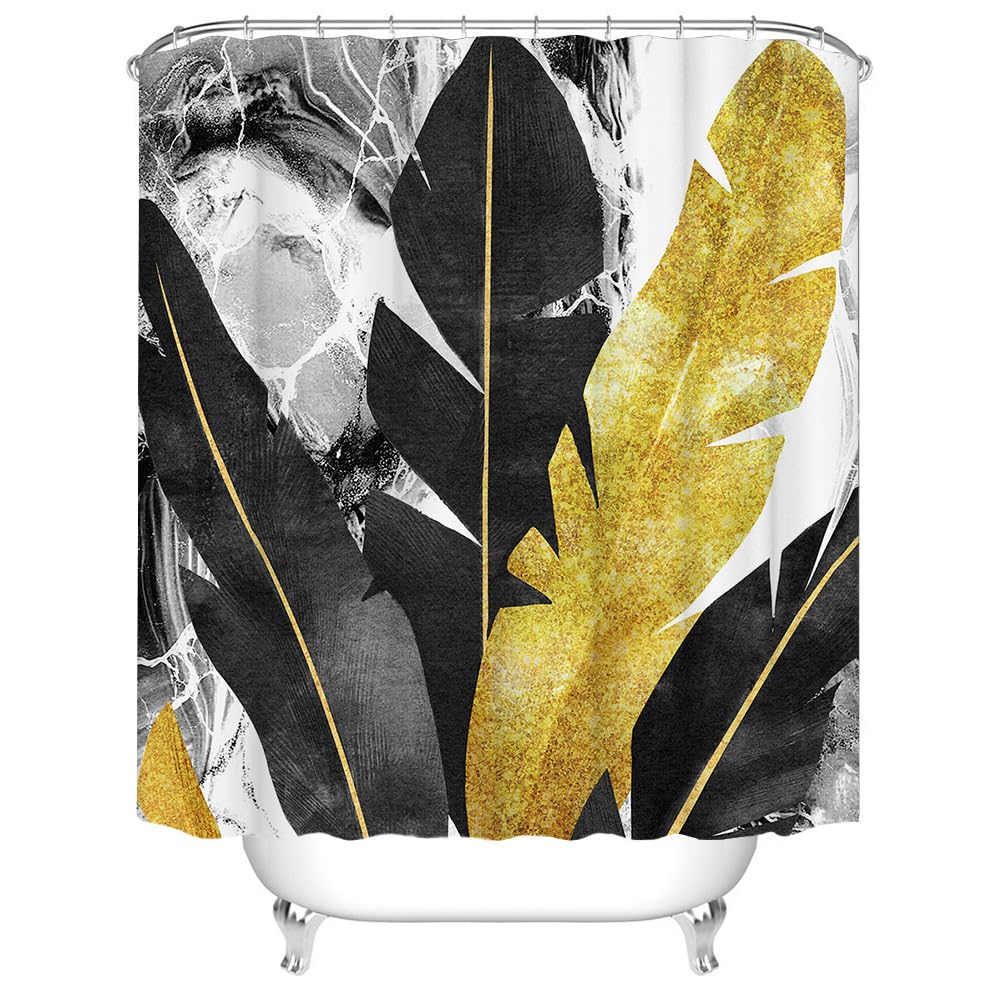 Transform your bathroom into a tropical paradise with this stunning shower curtain featuring a bold black and gold leaf design. The dramatic contrast between the deep black leaves and shimmering gold accents creates an eye-catching artistic statement that elevates any bathroom's decor. Measuring 72x72 inches, this shower curtain provides ideal coverage for standard-sized tubs and shower stalls. The Hawaiian-pattern brings a sophisticated touch of the tropics to your space, while the included hooks make installation quick and simple. The curtain's striking design combines modern aesthetics with natural elements, making it versatile enough to complement both contemporary and traditional bathroom styles. Whether you're doing a complete bathroom makeover or simply want to add a touch of elegance to your space, this black and gold shower curtain delivers both style and functionality. The large-scale leaf pattern creates a sense of drama while maintaining a refined aesthetic that won't overwhelm your bathroom's design.
