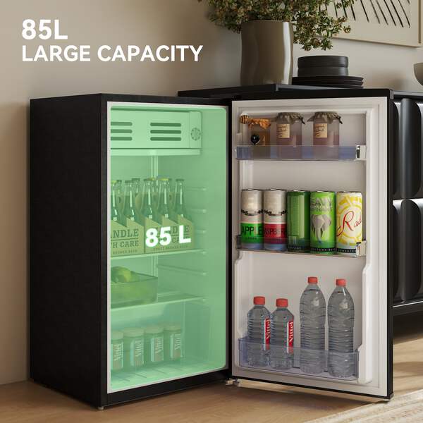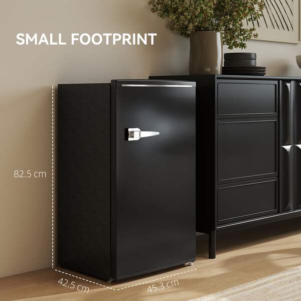 Looking for a free standing fridge for your flat, RV, shared room, or home office? The under counter fridge with ice box is great for keeping food, drinks and snacks fresh and organised. Its compact size makes it suit for small spaces. With a stylish retro design and a classic handle, it combines practicality and style. Enjoy the convenience of an adjustable thermostat and an interior light - this black fridge is great for any room.