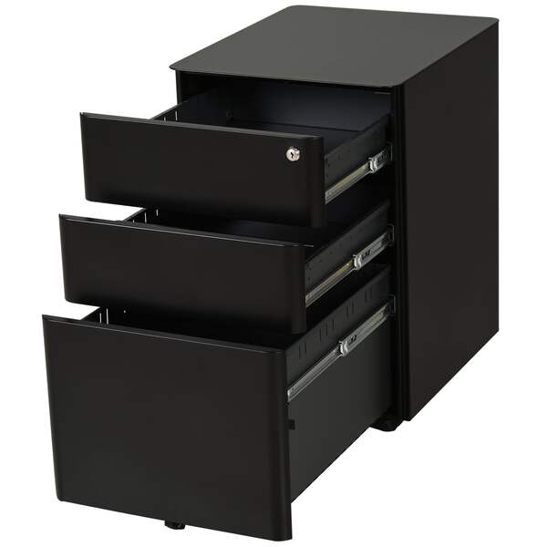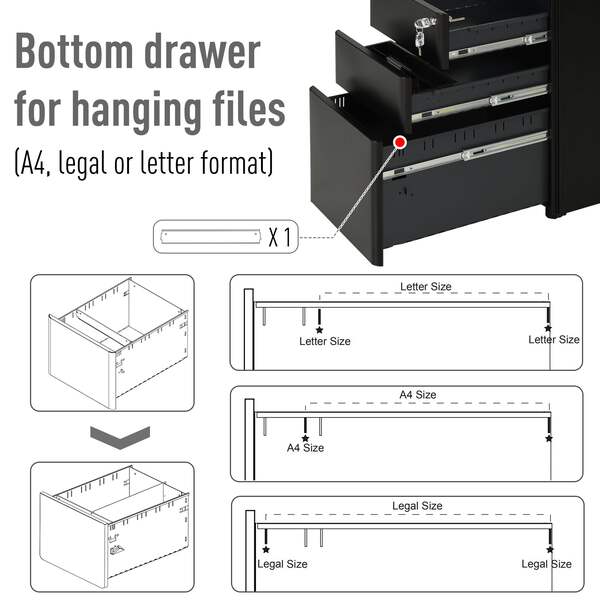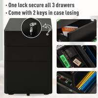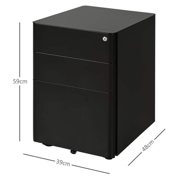 Keep your important paperwork organised and with this metal filing cabinet from Vinsetto. Spacious in size, it features two small drawers and a large bottom drawer - perfect for all your paperwork and other office supplies. On the bottom, four omni-direction wheels are placed for you to move the unit around easily and a middle wheel to prevent the unit from tipping over. Finished with a lock to keep everything safely secure when you're away.