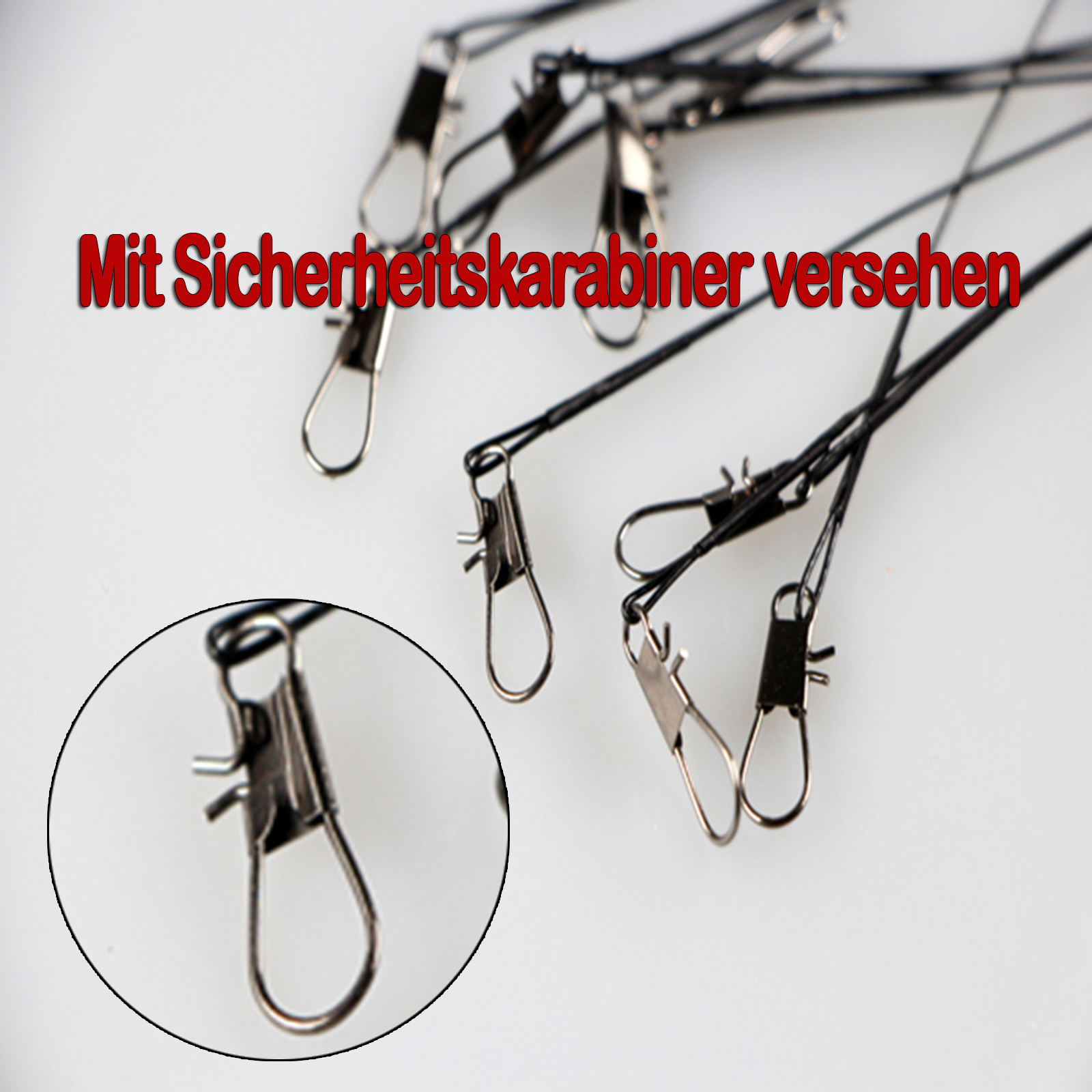Die Stahlvorfächer sind mit einem Sicherheitskarabiner versehen, dieser dient dem schnellen und bequemen Köderwechsel und bietet optimalen Schutz vor Raubfischzähnen.