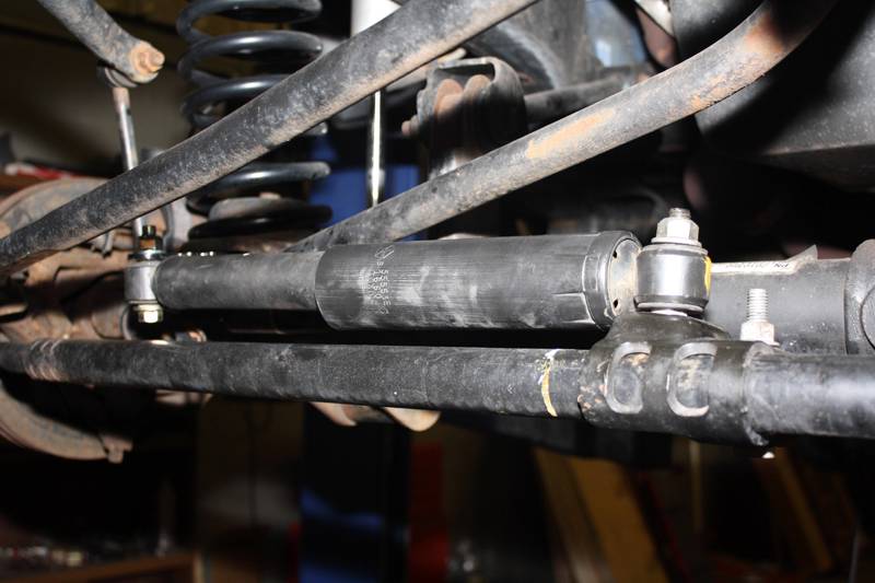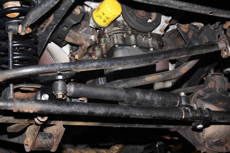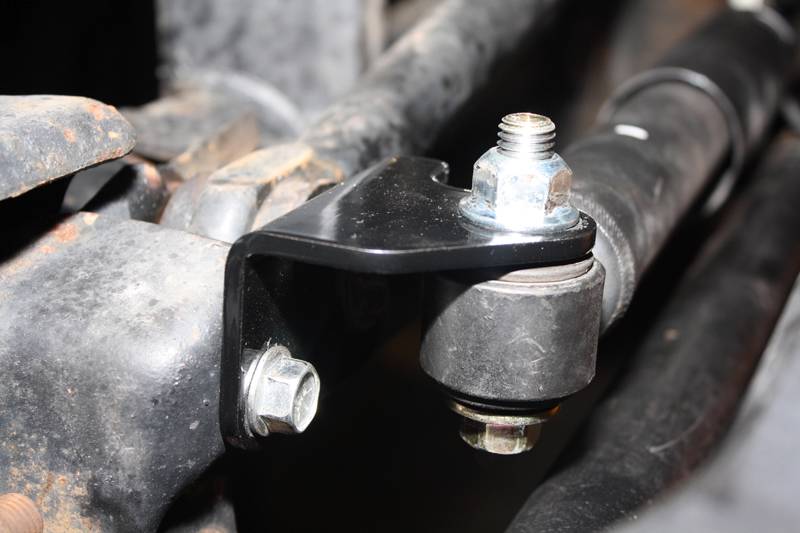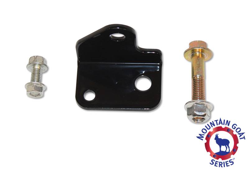 The Mountain Goat Series™ front steering stabilizer relocation bracket for the Jeep© JK Wrangler relocates the steering stabilizer to the top side of the steering tie rod, providing improved protection from rocks and other hazards.