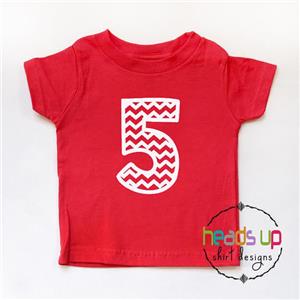 This adorable "Chevron 5" shirt is perfect for your little one. Use it to celebrate a 5th Birthday, document age, or wear on any day! It also makes a great gift! It is made using high quality heat transfer vinyl and comes on a solid colored t-shirt. Shirt color can be selected from drop down menu at checkout. White vinyl will be used for the number.