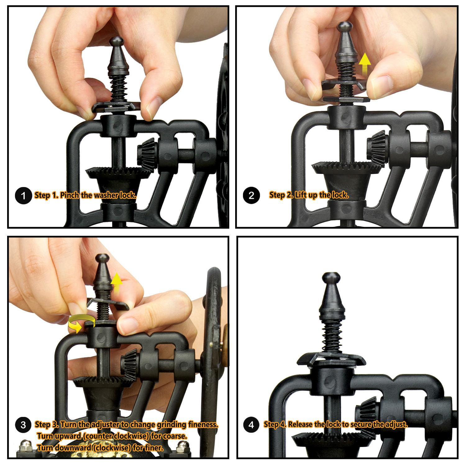 The ceramic burr grinder is adjustable for different grinding finesse. The adjusting instructions are shown in the product picture and included in the box.