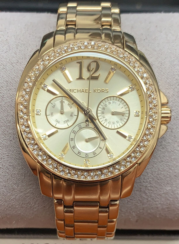 Watch Information: Gender: Women's Case Size: 38mm Dial Color: Gold Material Case: Gold Tone Stainless Steel Material Band: Gold Tone Stainless Steel Diamonds: n/a Movement: Analog Quartz Water Resist: 50 Meters Water Resistant Features: Analog Additional Info: Packaging: Michael Kors Box & Papers