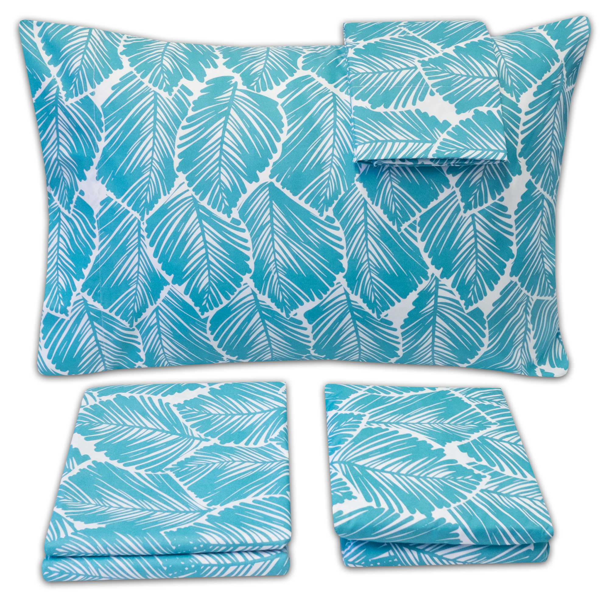 This monochromatic Tropical Leaf pattern has a bright, lighthearted feel with teal line-style palm leaves stacked over a crisp white background. No matter what’s outside your window, the Tropical patterned Sheet Set will add a tropical uplift and island smile to your space. The monochromatic teal design easily pairs with most color schemes and is easy to style, no matter what look you’re going for.