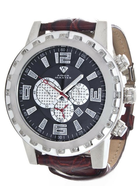 Aqua Master Mens Chrono Silver Case Burgundy Leather Band 0.24ct Diamond
