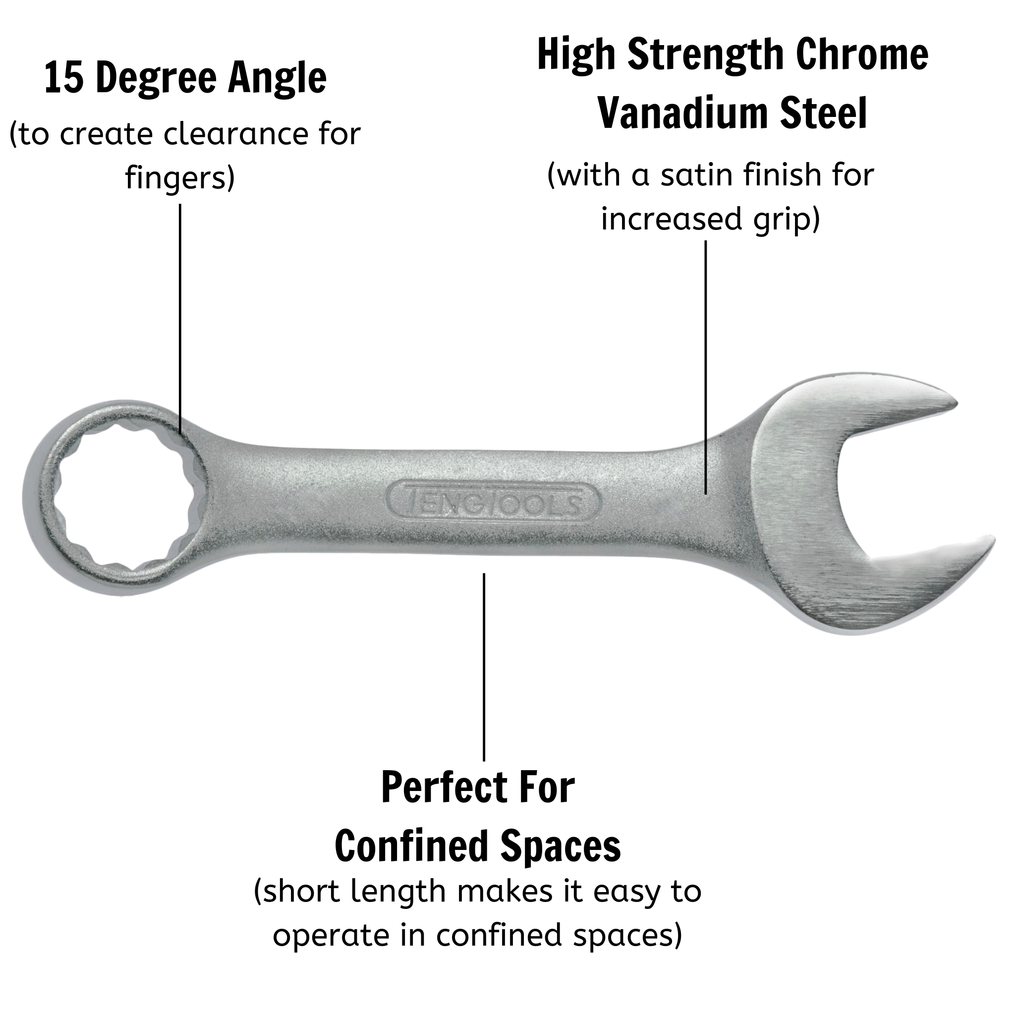 Midget combination spanner with the same dimensions at both ends. The 12 point ring head is set at a 15 degree angle. Made from chrome vanadium with a satin finish.