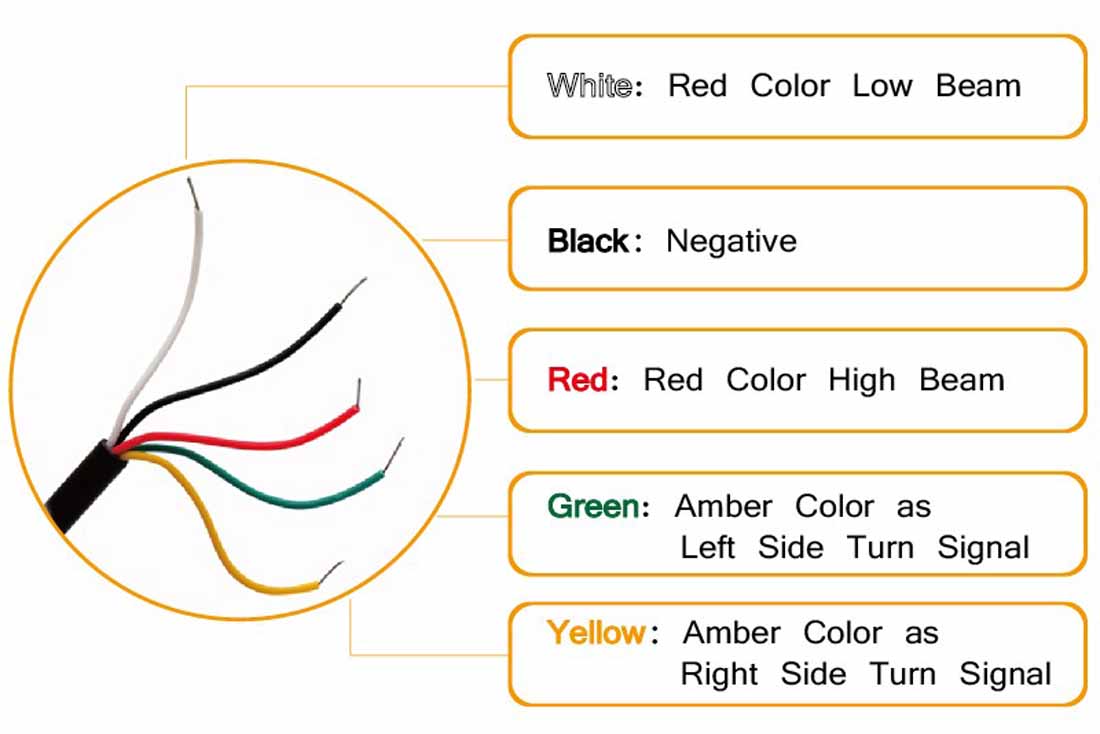 5 wires connection. (Black for Negative, Red for Brake Light, White for Running Light, Green for Left Turn Signal and Yellow for Right Turn Signal)