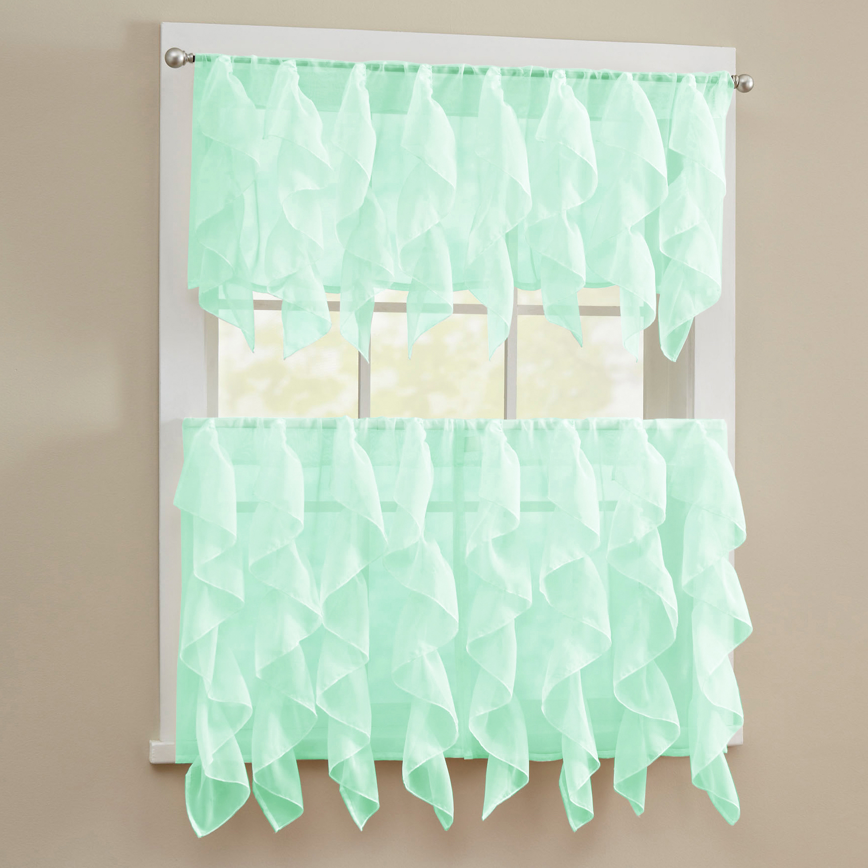 Add a touch of modern style to your home decor with these voile verticle ruffled tier Kitchen Window Curtain ensemble pieces. Featuring a vertical cascading ruffle pattern that offers a light filtering privacy and decorative shabby chic texture to your windows.