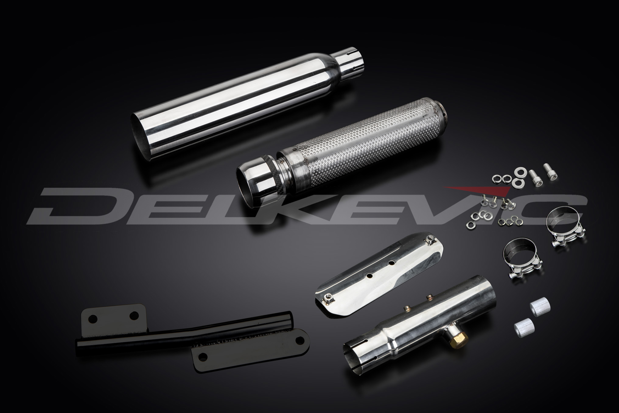 Delkevic silencers with removable baffles, link pipes, bracket, washers, cap screws, and clamps