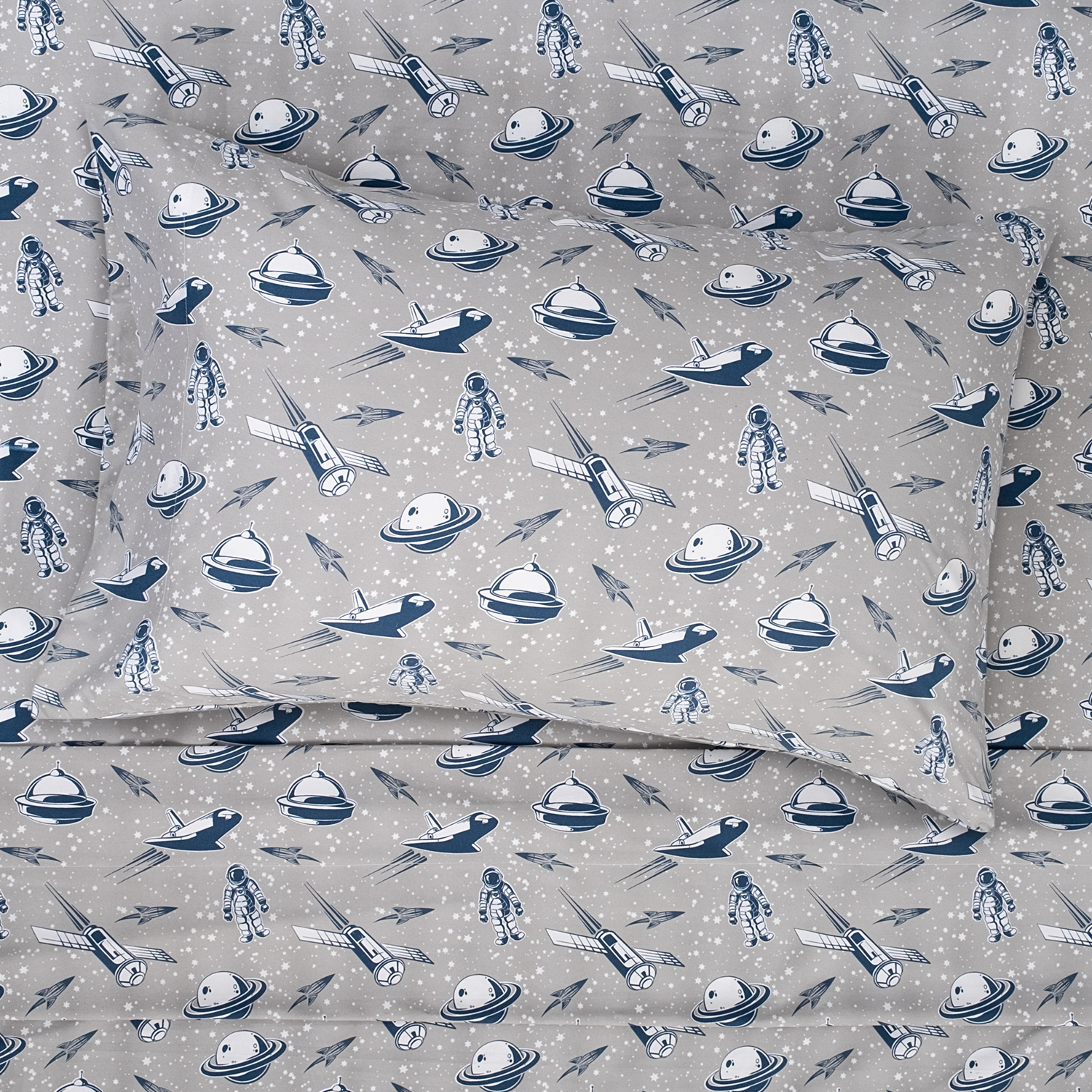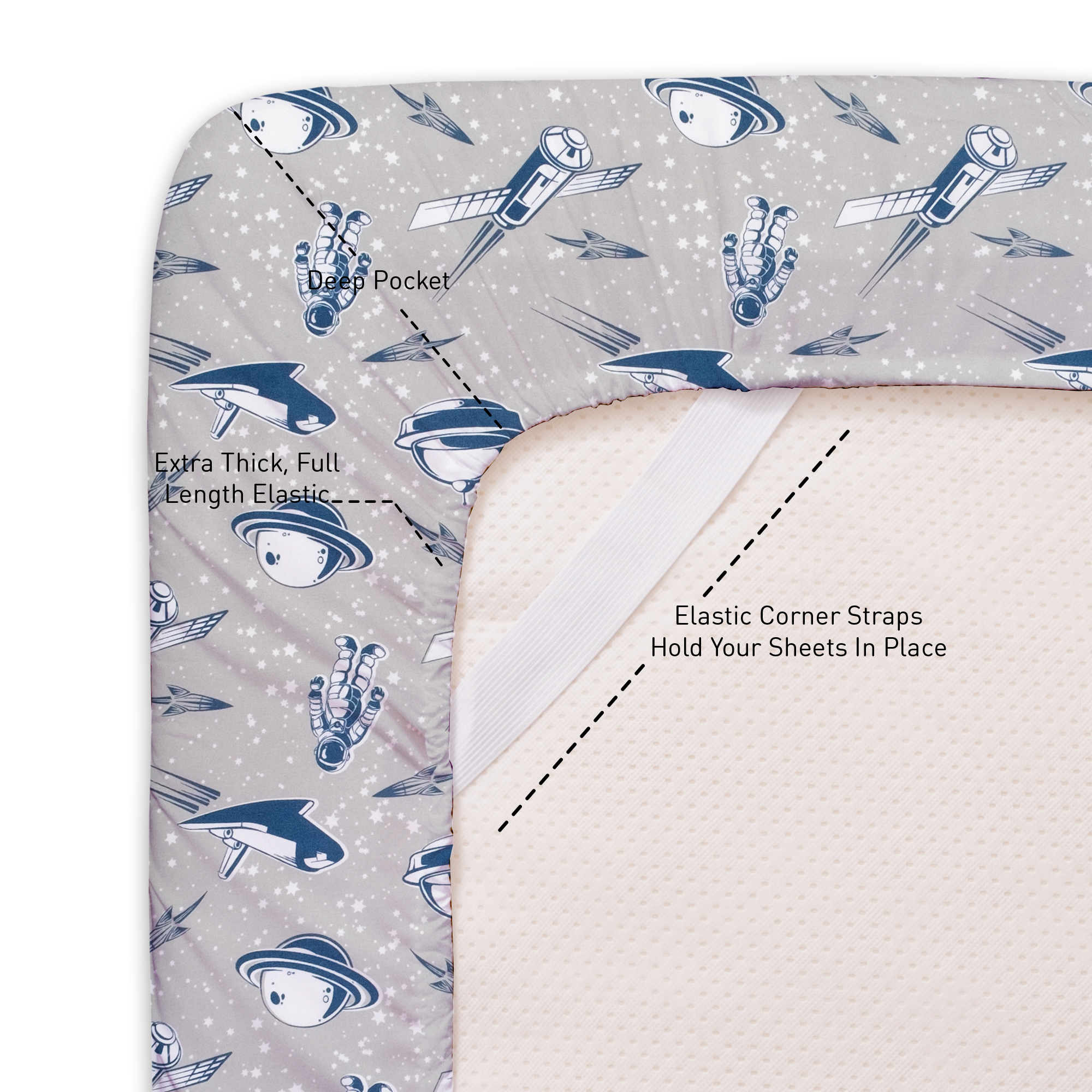 Our Spaceships Sheet Set is out of this world! Decorated with futuristic ships, satellites, planets and stars, your little astronaut will love the playful details on this sheet set.
