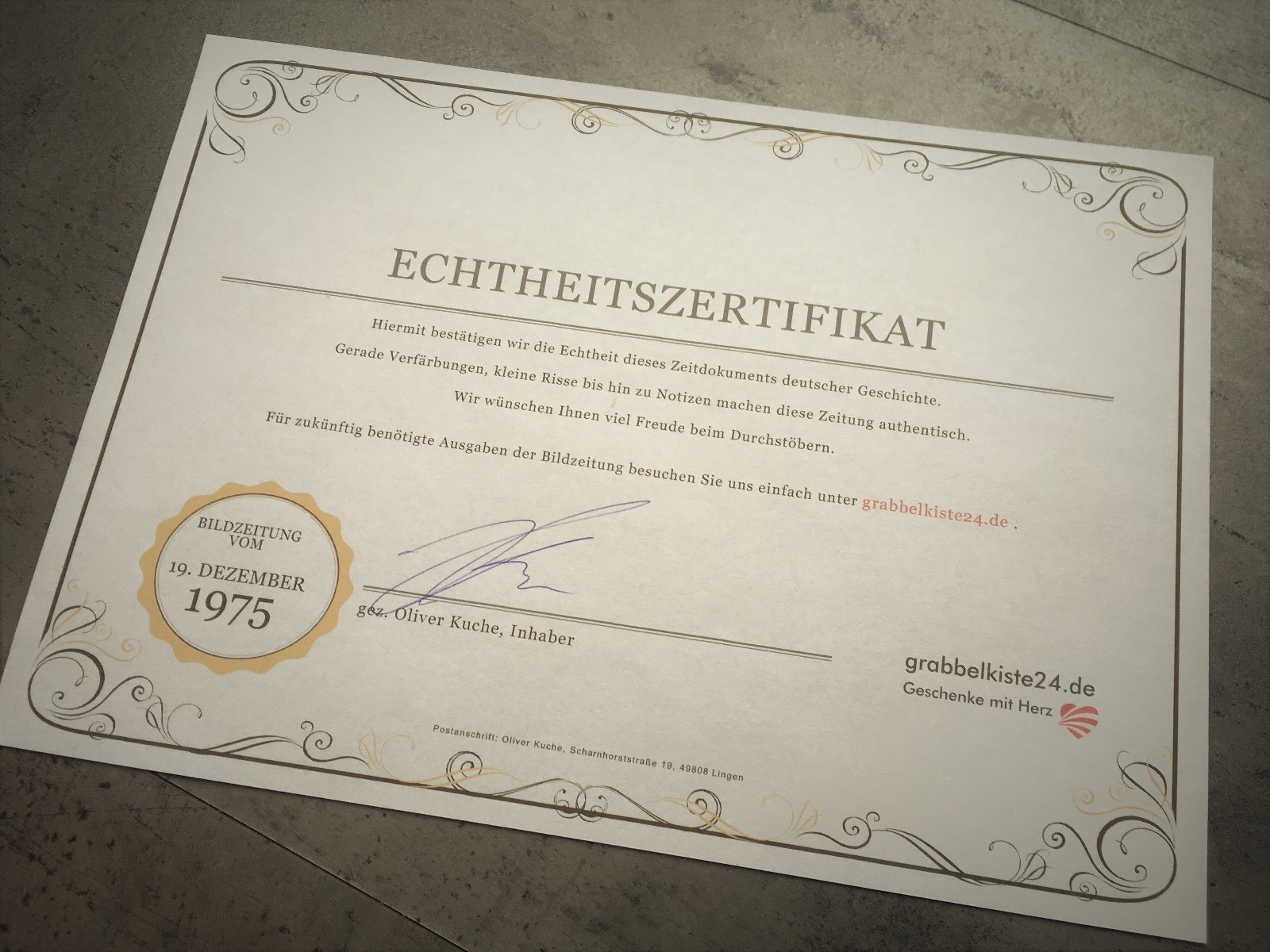 Sie kaufen eine Zeitung mit dem oben genannten Datum und erhalten dazu ein von uns erstelltes Echtheitszertifikat.