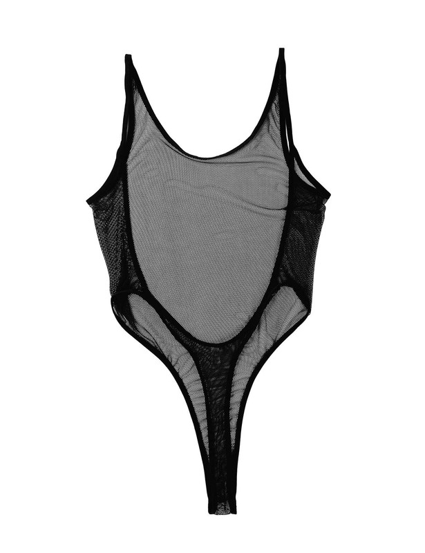 See through fishnet design, U-neckline and backless, high cut legs, pull on closure.