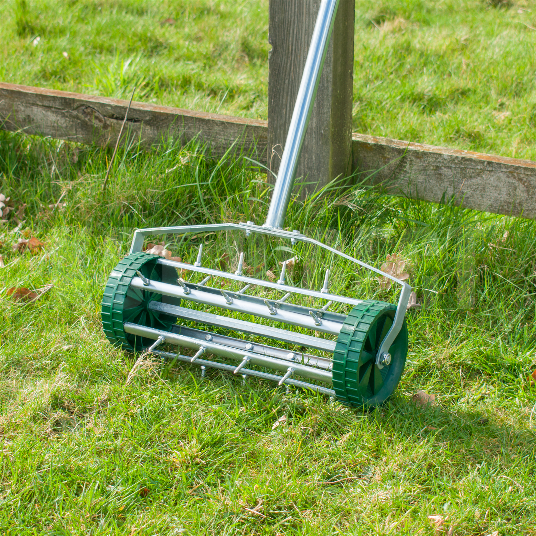 The Garden Spike Roller is a simple tool used to aerate your lawn, helping to generate healthy grass growth.