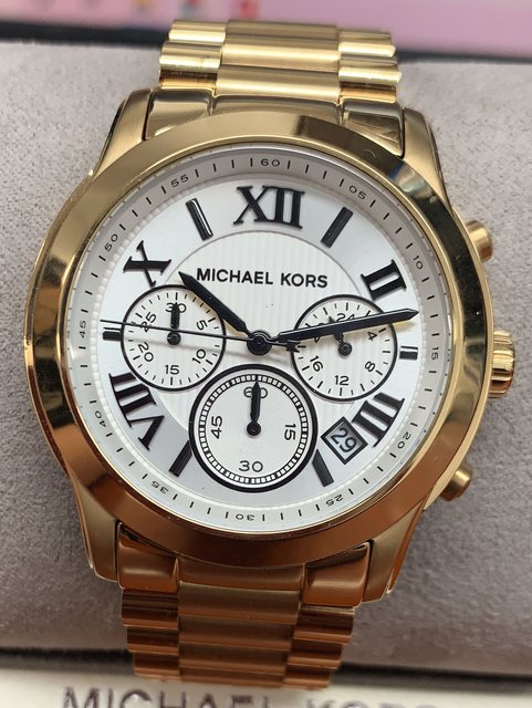 Watch Information: Gender: Ladies Case Size: 39mm Dial Color: White Material Case: Stainless steel Material Band: Stainless Steel Diamonds: n/a Movement: Analog Quartz Water Resist: 100 Meters Water Resistant Features: Date, Chronograph Clasp/Buckle: Deployment Buckle Additional Info: Packaging: Michael Kors Box & Papers