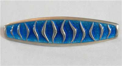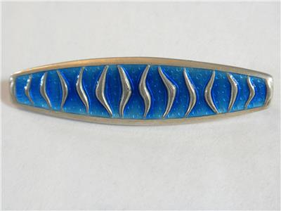 Great looking blue enamel pin brooch from David Andersen. As part of the Wave series, it was designed to look like water-there are tiny bubbles ascross the pin. It was designed by Agnar Skrede for David-Andersen in 1954. As a mid-century modern classic, the Wave series has a devoted following. It measures just a little over 2 inches long and a little over 1/2 inch high at the center. Pre-owned. Very nice condition. No flaws noted. Enamel in good shape with no losses. Pin mechanics work well.