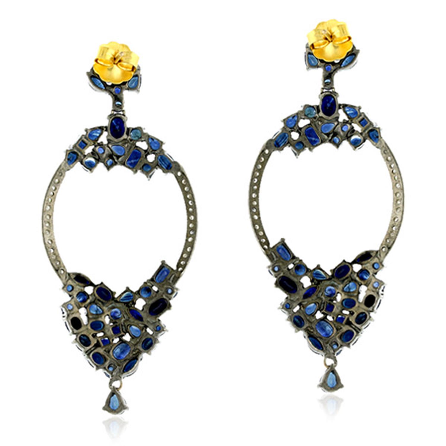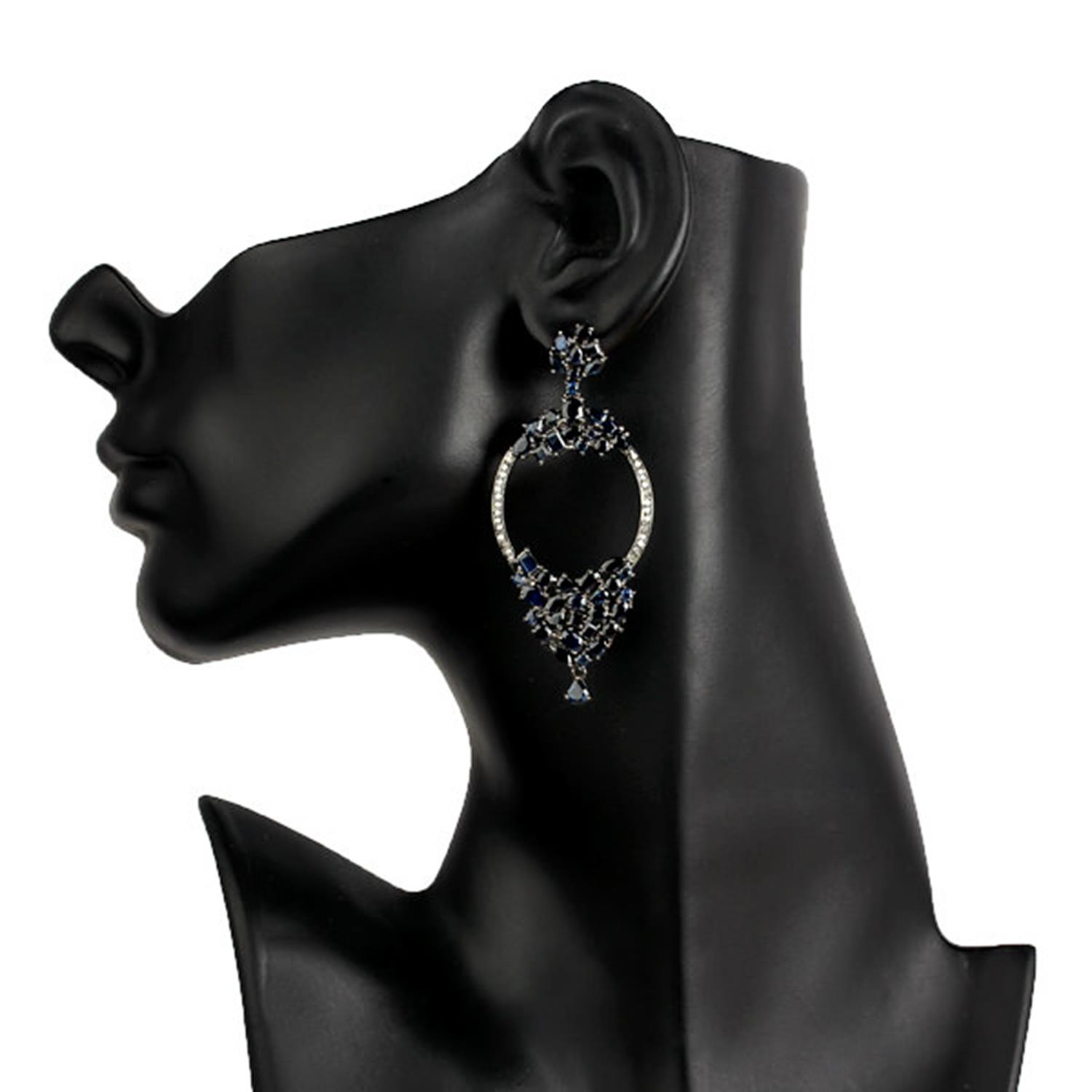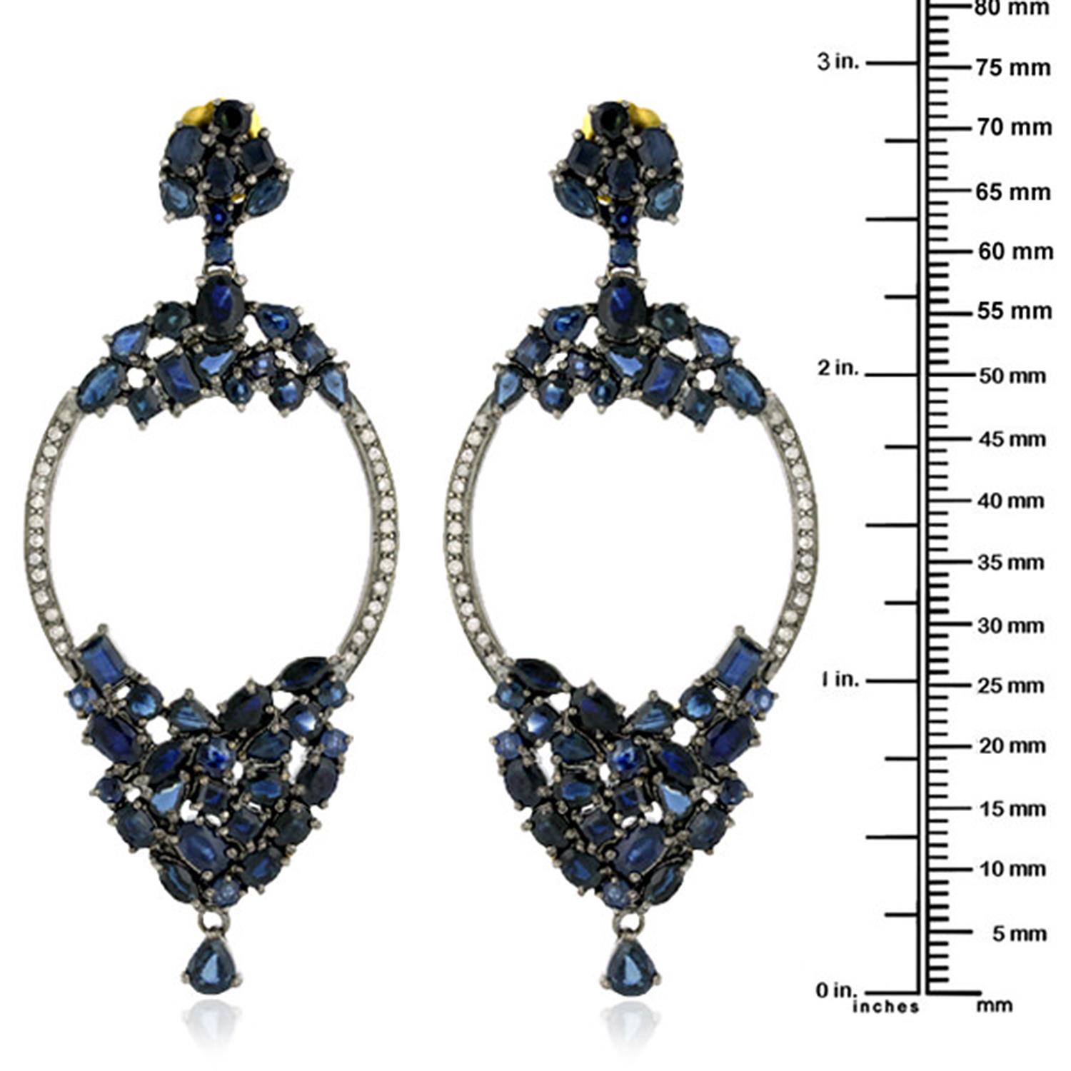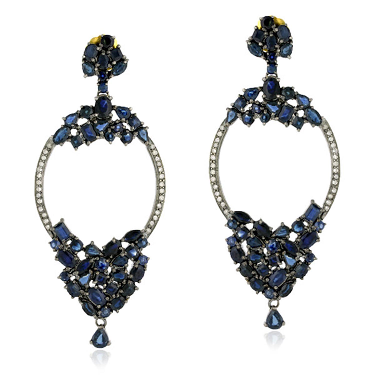 18k Gold Pave Diamond Blue Sapphire Designer Dangle Earrings 925 Silver Jewelry