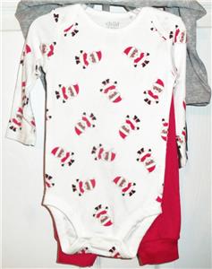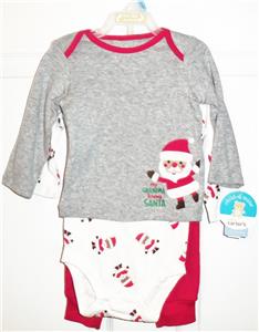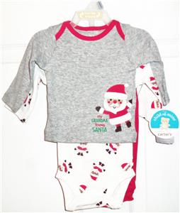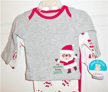 We have up for Auction a Carter's Child of Mine Christmas 3 pc Pant Set. "MY GRANDMA KNOWS SANTA" Choose Size NB or 3-6 months! New with Tag. Adorable..This Set comes with a Long Sleeve Bodysuit, a Long Sleeve Top and a pr Pants/Leggings. The Top has Santa Claus & Snowman on the front. The Bodysuit has Santa all over it. and the Pants has Santa on the back. They are made of 100% cotton. This set would be cute for a Christmas gift or for your lil One! NEW