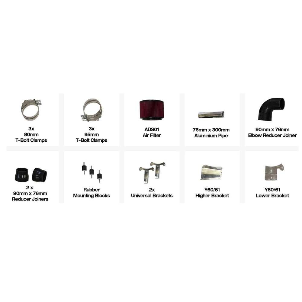 • Due to the many snorkel styles and positioning of turbocharges, fuel injection and or diesel air input, we have supplied 2 x silicone straight joiners, 1 x 90 degree silicone elbow and 1 x 30cm long aluminum pipe to cater for most fitment applications. If extra piping or silicone is required, must be purchased separately
