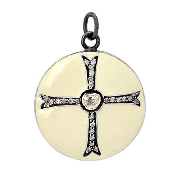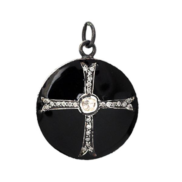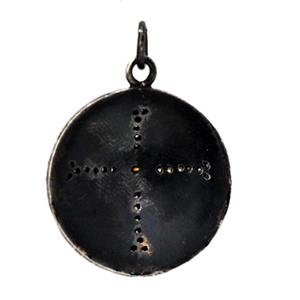 0.16ct Uncut Diamond Religious Black Round Cross Pendant 925 Sterling Silver