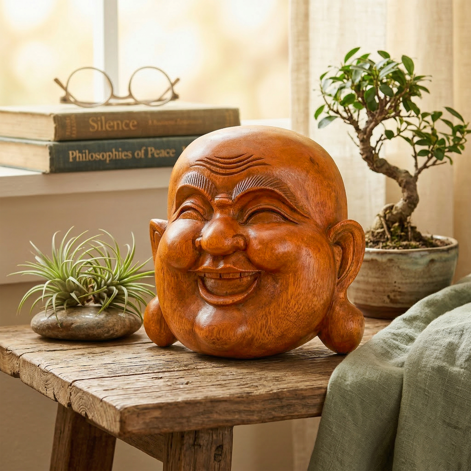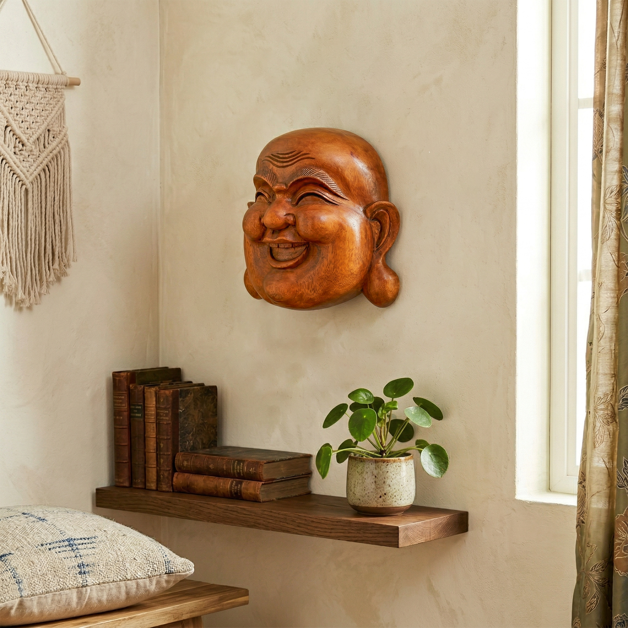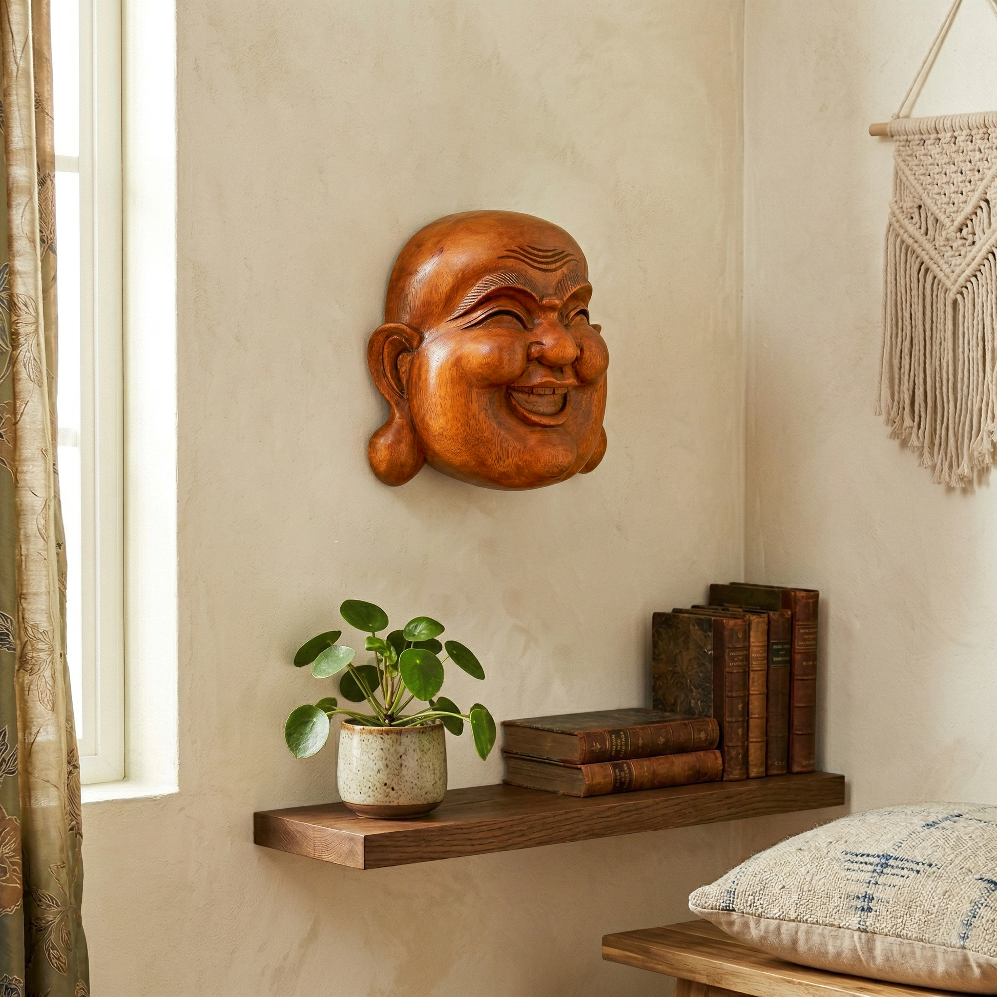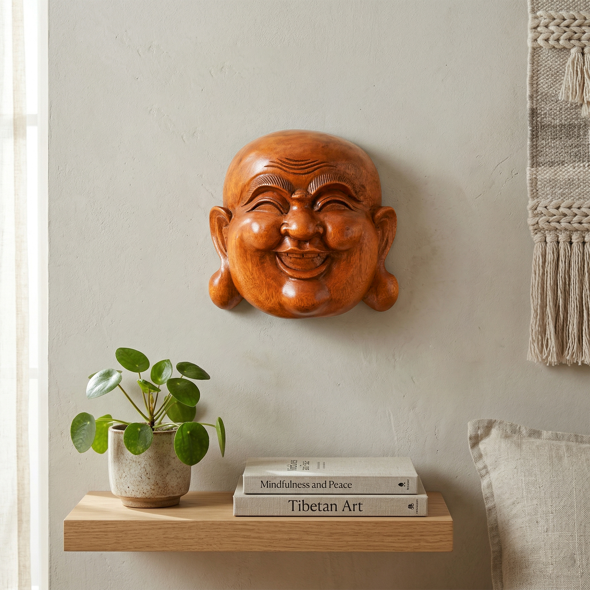 This wonderfully crafted happy Buddha mask will make a great addition to your home. Based on Budai, the Chinese inspired mask is a symbol of wealth, happiness, and generosity. Legend says he was a monk that gave treats to children and also protected them from harm. Its larger size of 9" tall x 8" wide showcases the details and characteristics of the wood bringing out the beautiful highlights in each carving. It can be hung on a wall or rested on a surface. The Happy Buddha wooden mask makes a great gift for friends and family.