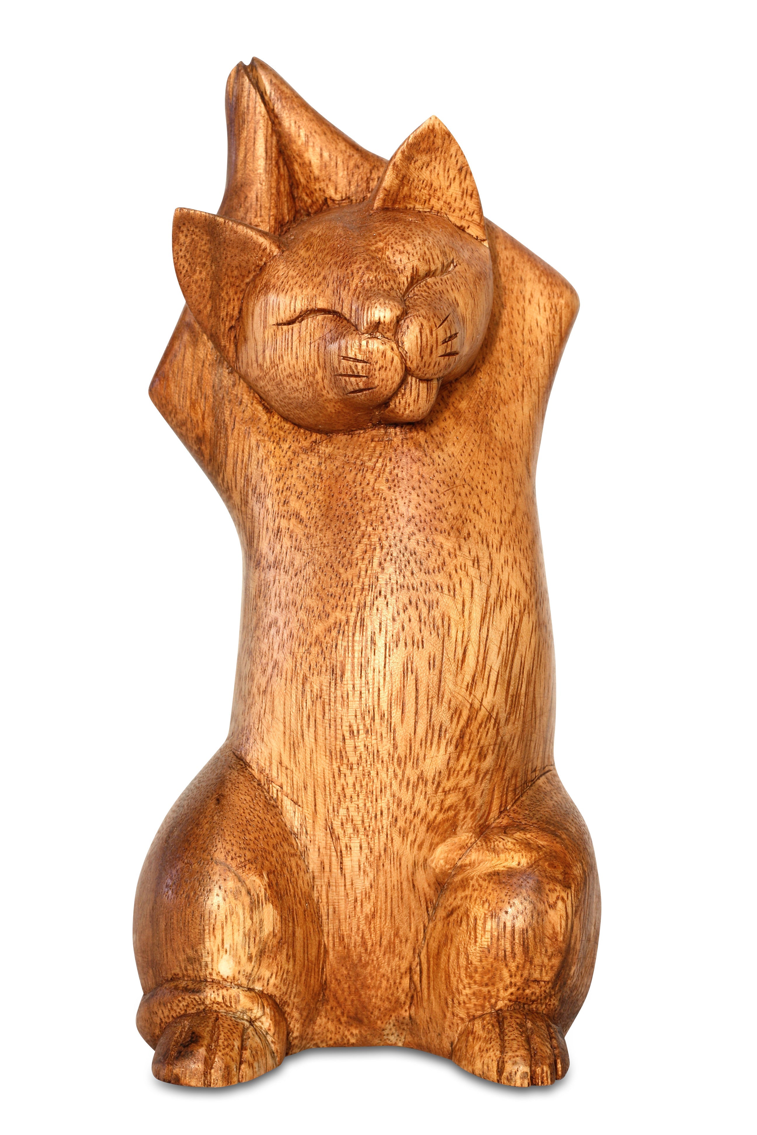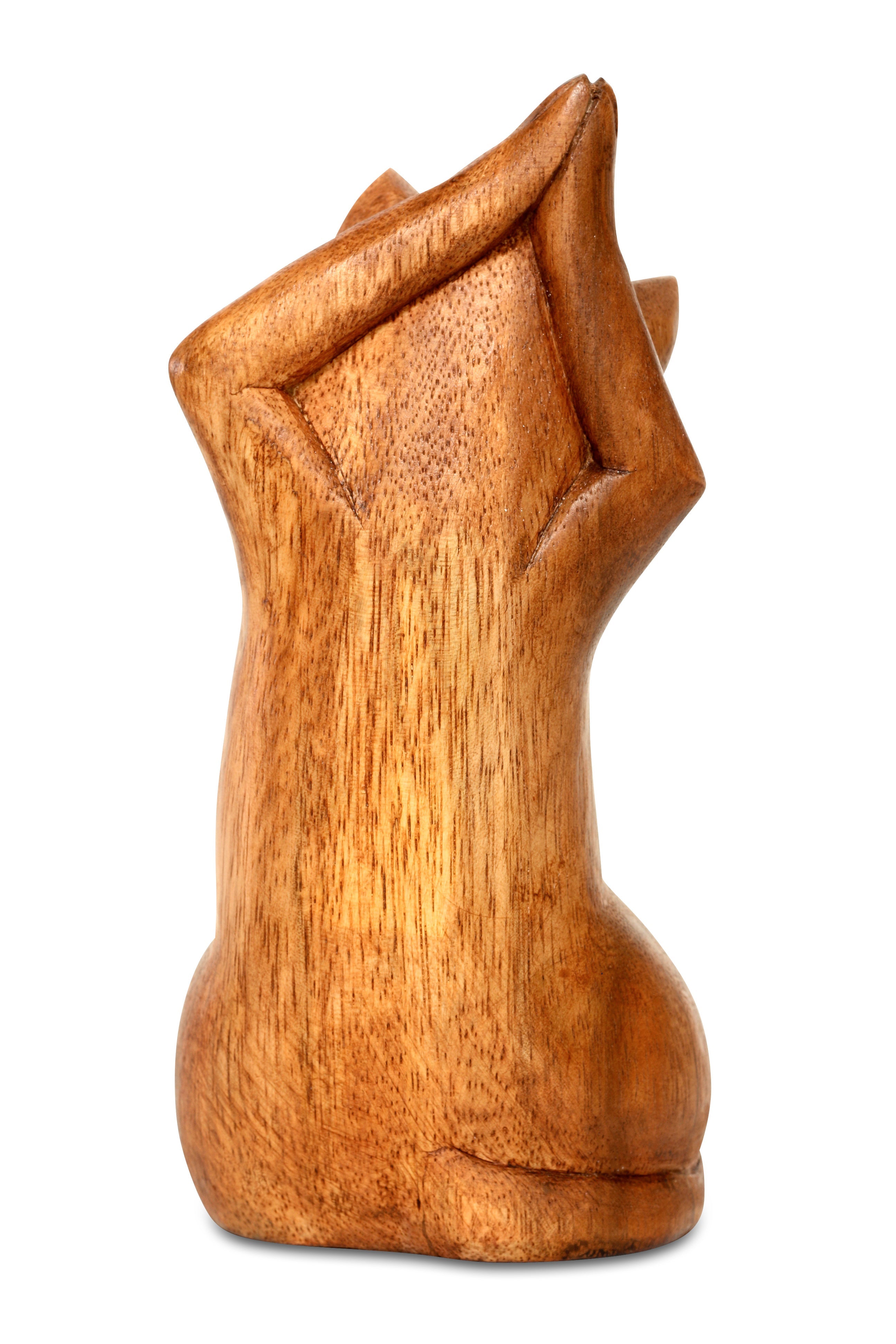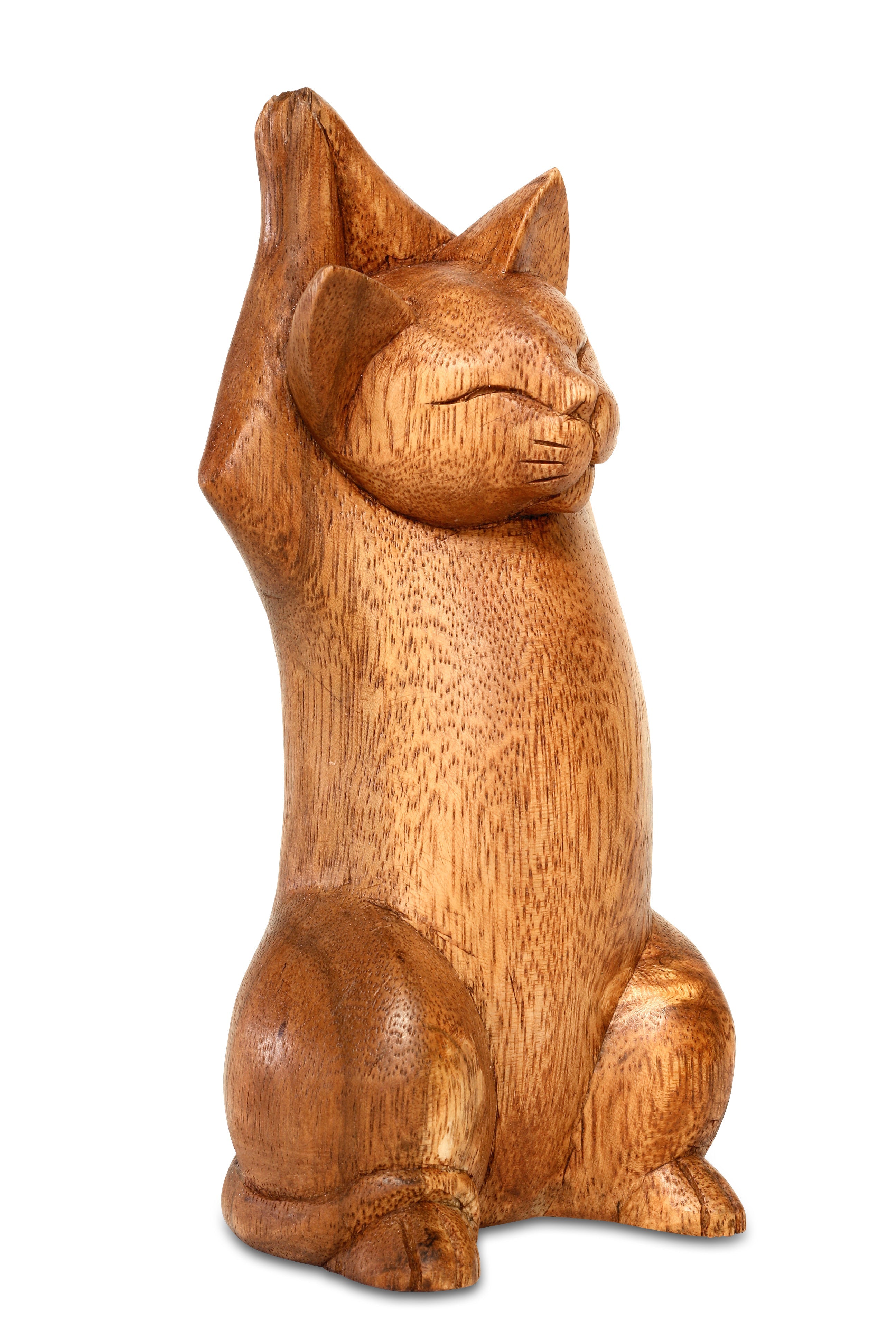 Feel calm, happy and whimsical with this handsome hand carved cat. Made of solid rain tree wood with beautiful multi tonal highlights, our cat is able to hold her yoga pose exhibiting tremendous strength and feline flexibility. Each cat has wonderful attention to detail unique wood patterns. This statue is a fabulous gift for cat lovers and yoga fans alike.