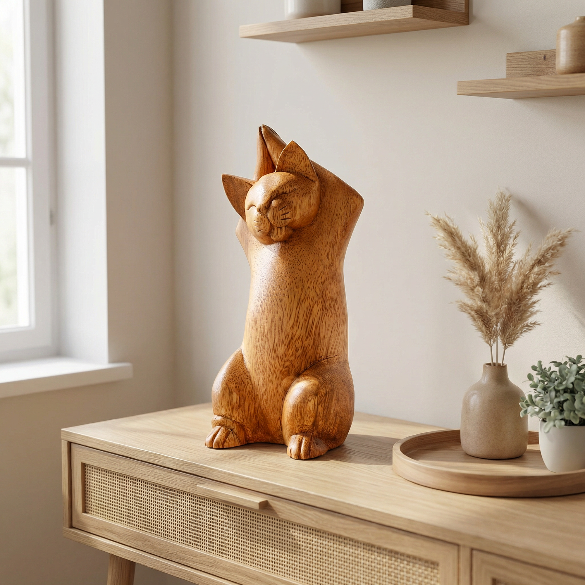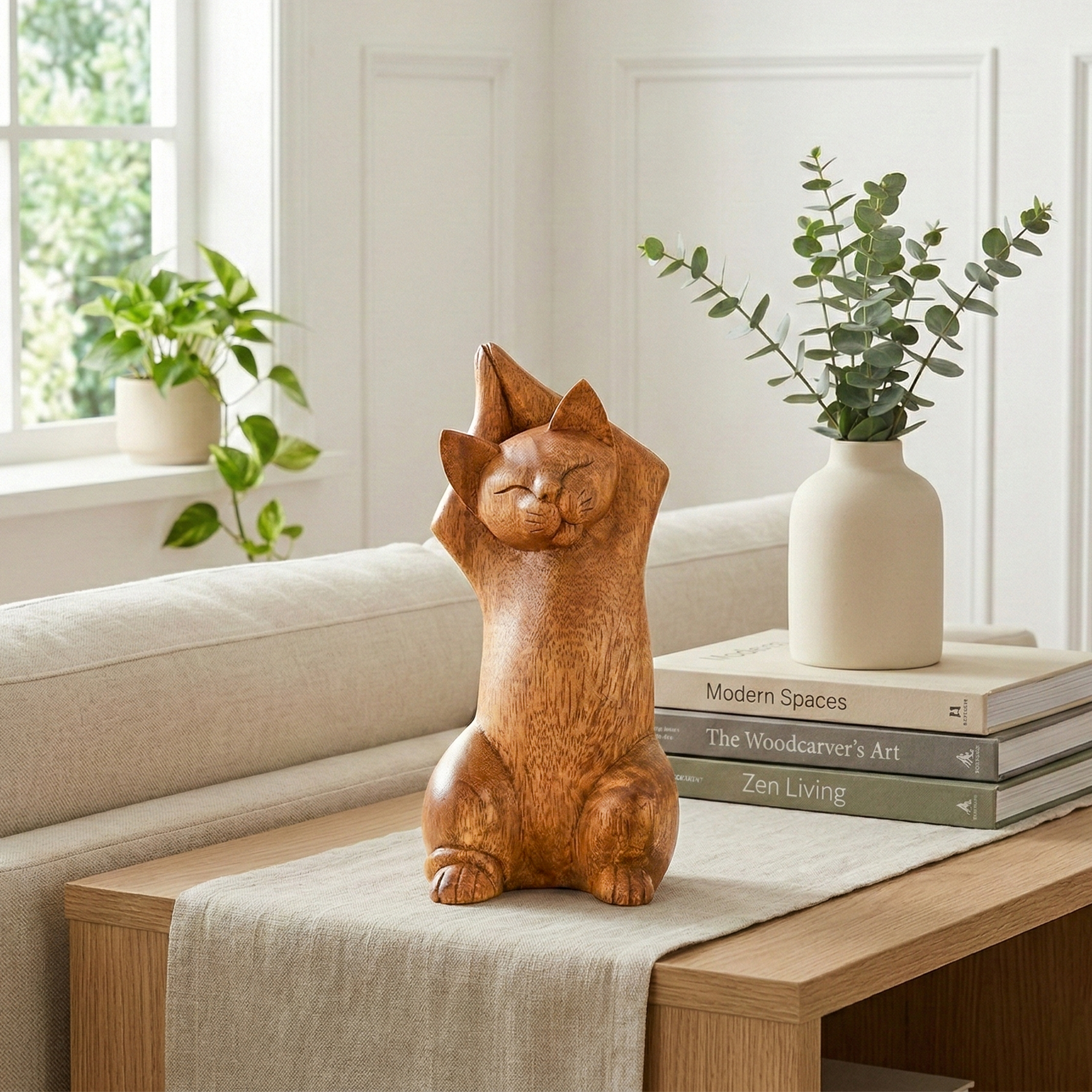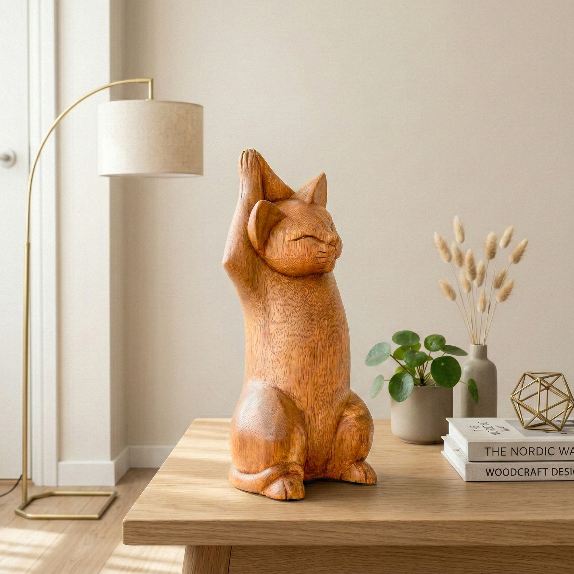 Feel calm, happy and whimsical with this handsome hand carved cat. Made of solid rain tree wood with beautiful multi tonal highlights, our cat is able to hold her yoga pose exhibiting tremendous strength and feline flexibility. Each cat has wonderful attention to detail unique wood patterns. This statue is a fabulous gift for cat lovers and yoga fans alike.