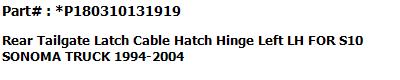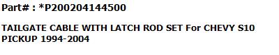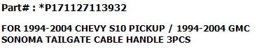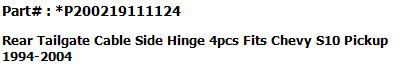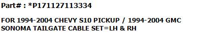 Bundle For CHEVY S10 PICKUP 1994-2004 / GMC SONOMA PICKUP 1994-2004 #1 TAILGATE CABLE LH #2 TAILGATE CABLE RH #3 TAILGATE HINGE LH #4 TAILGATE HINGE RH |