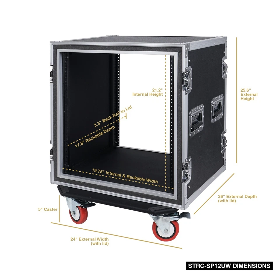 Introducing the STRC-SPB12UW Black Series Shock Mount 12U rack case, a sleek and stylish solution for securing and transporting your equipment. This rack case stands out with its all-black anodized hardware, offering not only robust protection but also an aesthetic edge to your setup. The STRC-SPB12UW provides ample space with 12U rack capacity and a 21.1-inch rackable depth (with lids), ensuring a perfect fit for your equipment. |