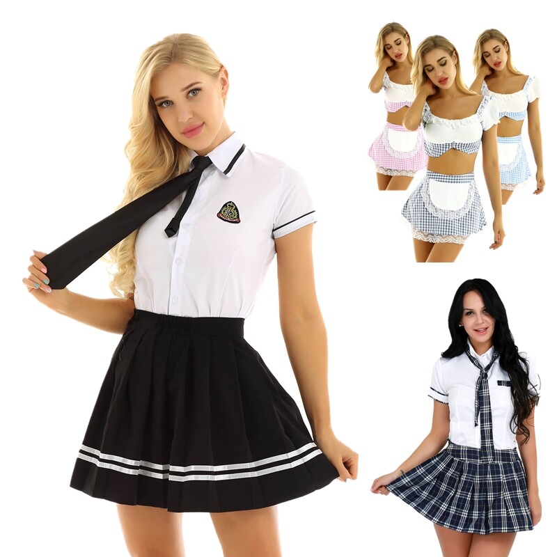 Set Include: 1Pc Crop Top, 1Pc Skirt, 1Pc Necktie, 1Pc G-string