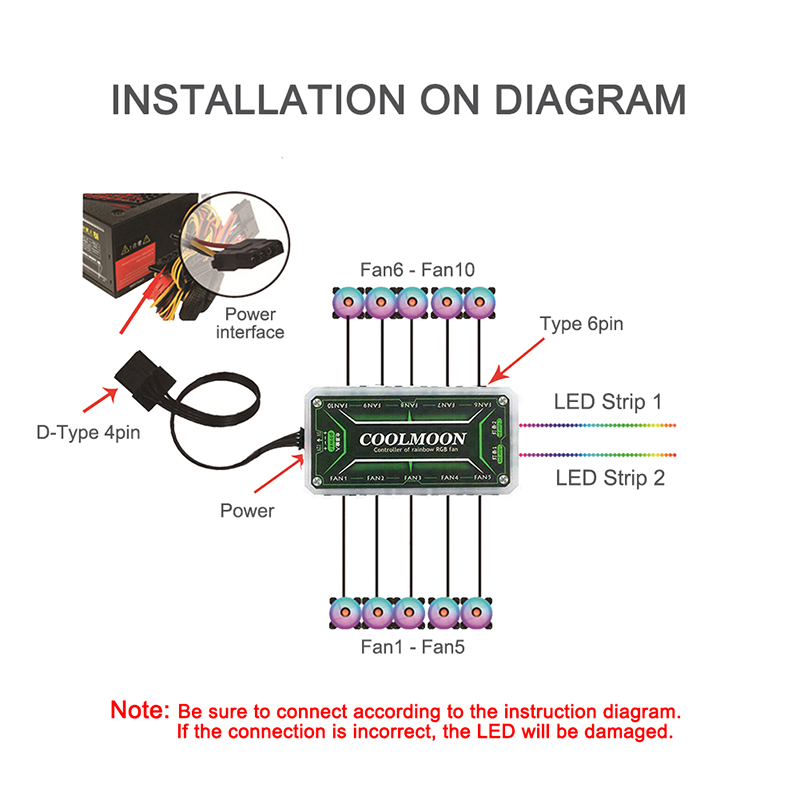 5. Fans must be connected in accordance with the sequence FAN1~FAN10, fan can only connect to the fan dedicated interface, the lamp belt can only connect to the lamp belt dedicated interface.
