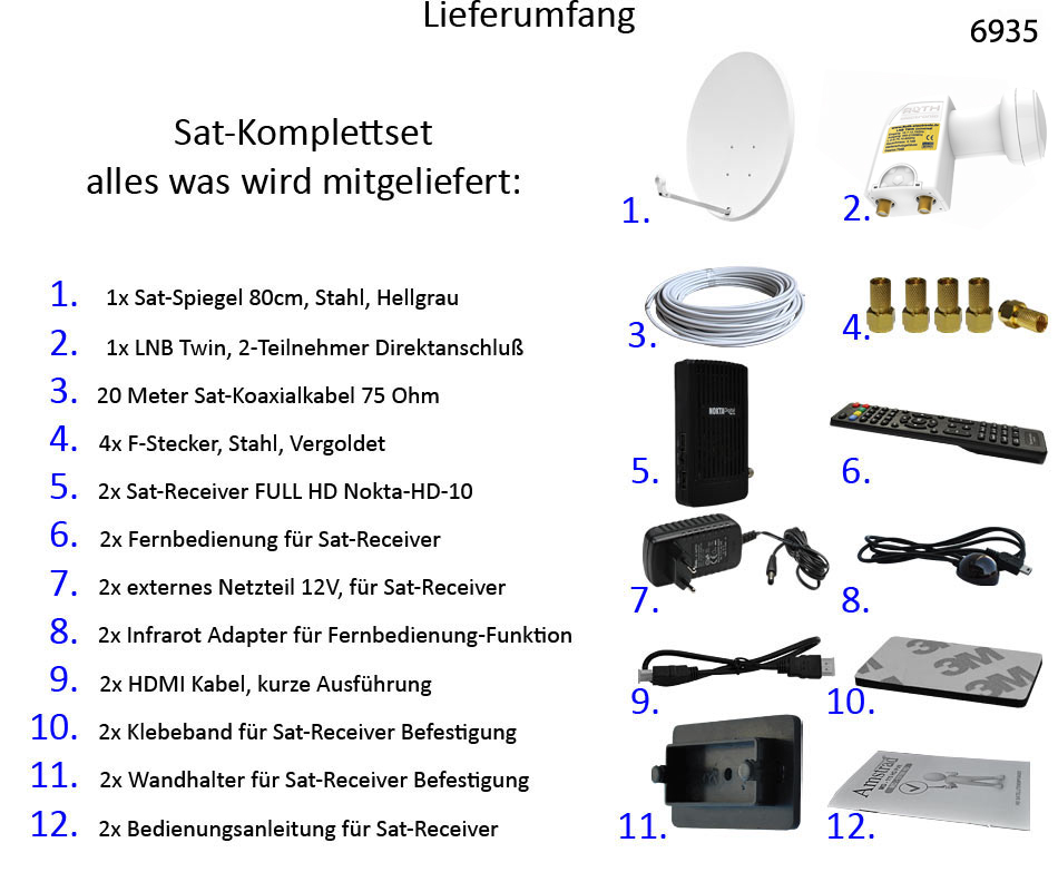 Komplettset bestehend aus 80cm Sat-Spiegel, Twin LNB mit nur 0,1dB Rauschmass, 75 Ohm Koaxialkabel und ZWEI digitalen FULL HD FTA Satelliten Receiver "Nokta-HD-10".