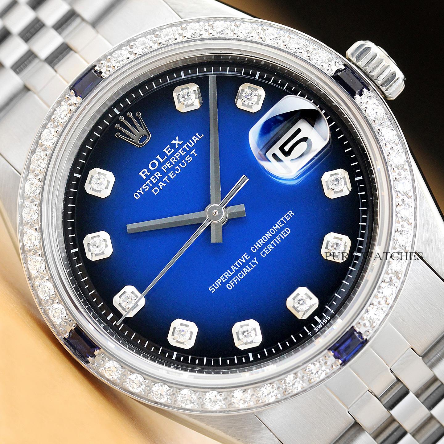 This is an authentic Rolex Datejust 1603 watch with Rolex dial Ref. with added diamond hour markers, custom 18K white gold sapphire diamond bezel, and custom stainless steel jubilee bracelet.