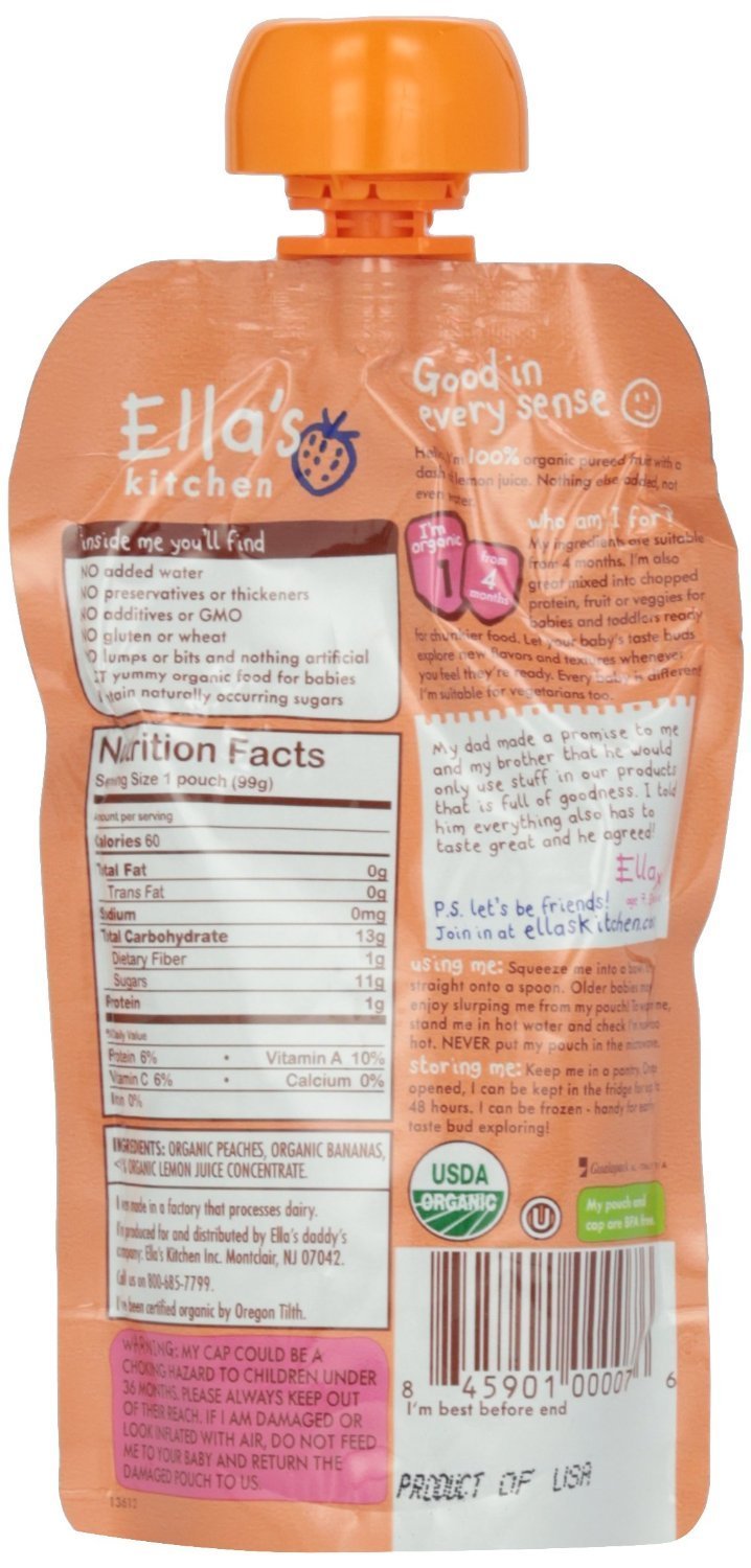 Ella's Kitchen Peaches and Bananas fruit pouches can be given to babies over 4 months during the first stages of weaning., , Ella's Kitchen Stage 1 fruit pouches are also suitable for gently warming through, Ella's Kitchen recommend doing so in either a saucepan or a microwavable bowl. Do not put the pouch directly in the microwave, simply squeeze the baby food out of the pouch and into the bowl. Alternatively the pouch can be stood in hot water for a few minutes to warm through. Always test the temperature of food before offering to your baby., ,